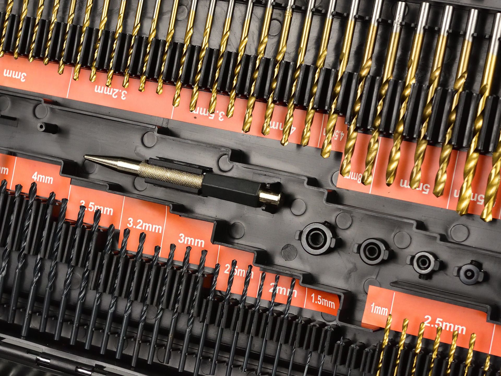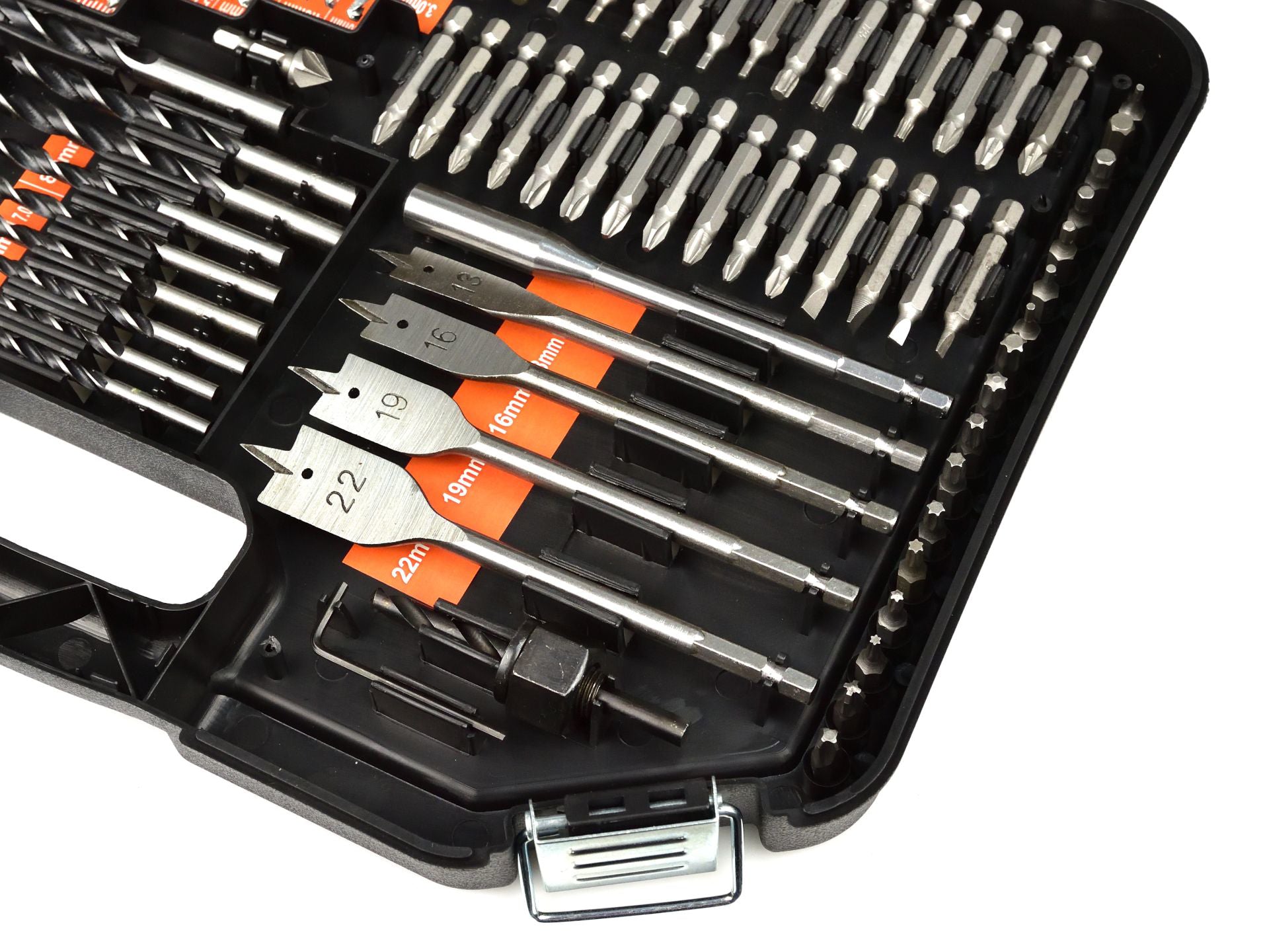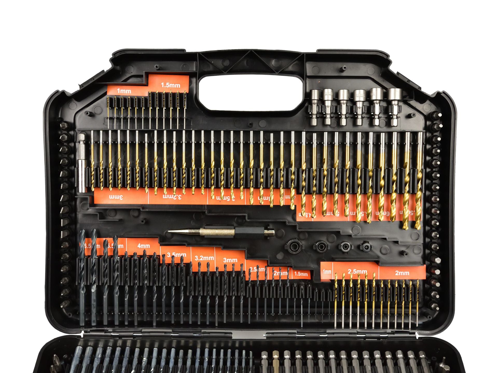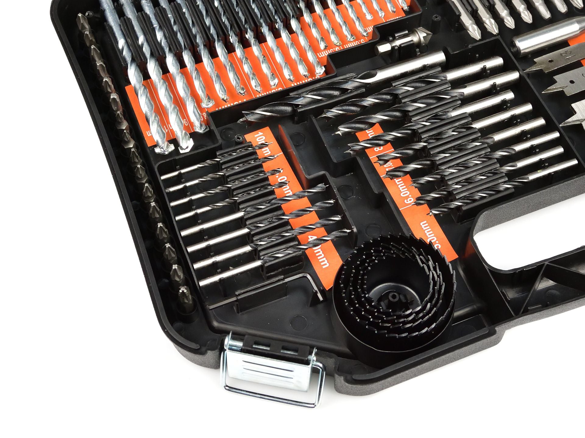 Un set extins de burghie, burghie, ferastrau cu gaura si prize pentru surubelnita. Setul va fi folosit in fiecare atelier de bricolaj. Intregul set este ambalat intr-o cutie de plastic la indemana.