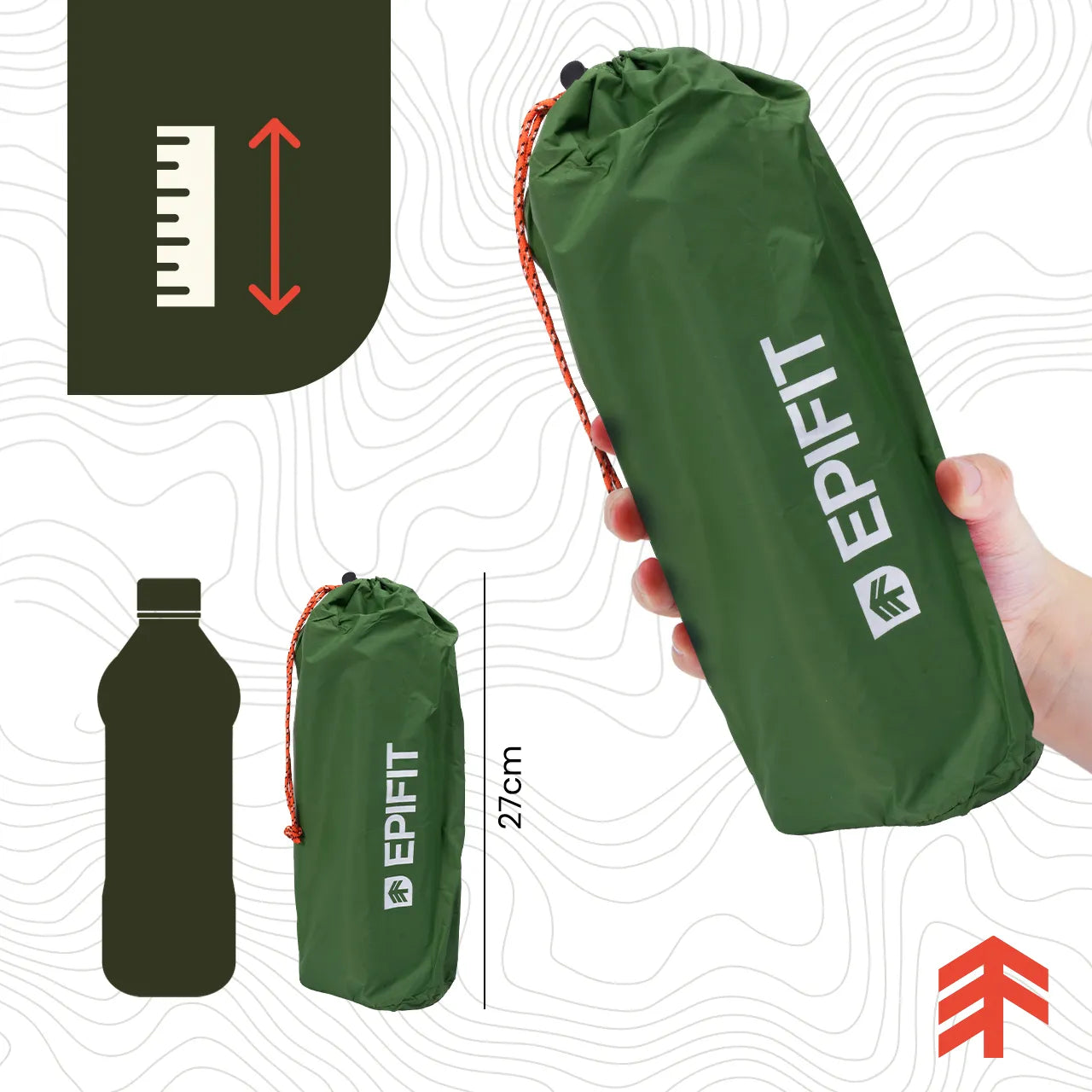 Cand este desfacut, masoara 190 x 60 cm si are o grosime de 5 cm, ceea ce asigura o odihna confortabila pe teren. Cand este pliat, este compact si usor de transportat - incape intr-un rucsac.