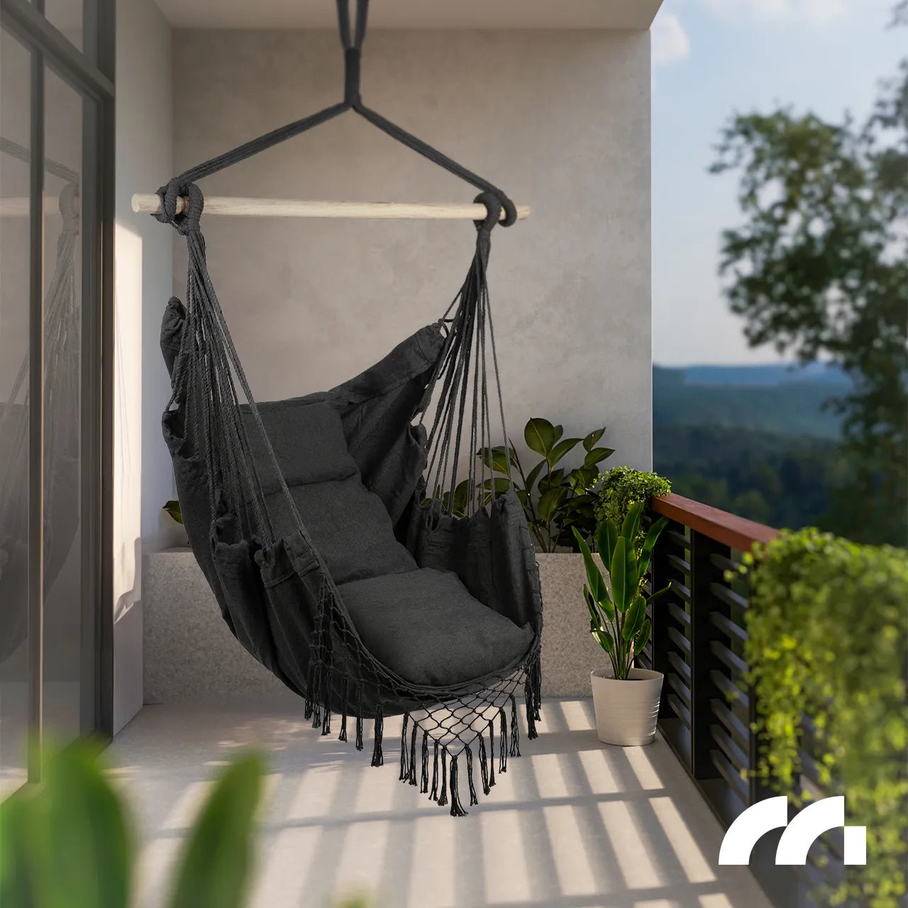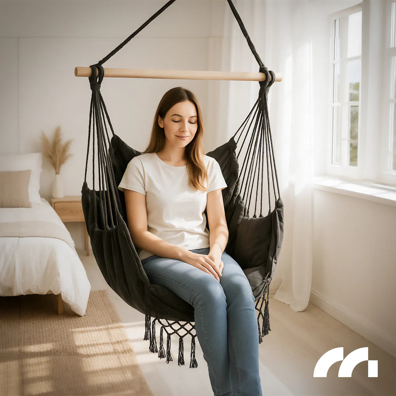 Fotoliul suspendat ofera oportunitatea de a-ti crea propriul refugiu plin de frumusete, confort si inspiratie, invitandu-te sa creezi momente de neuitat inconjurat de natura si design estetic.