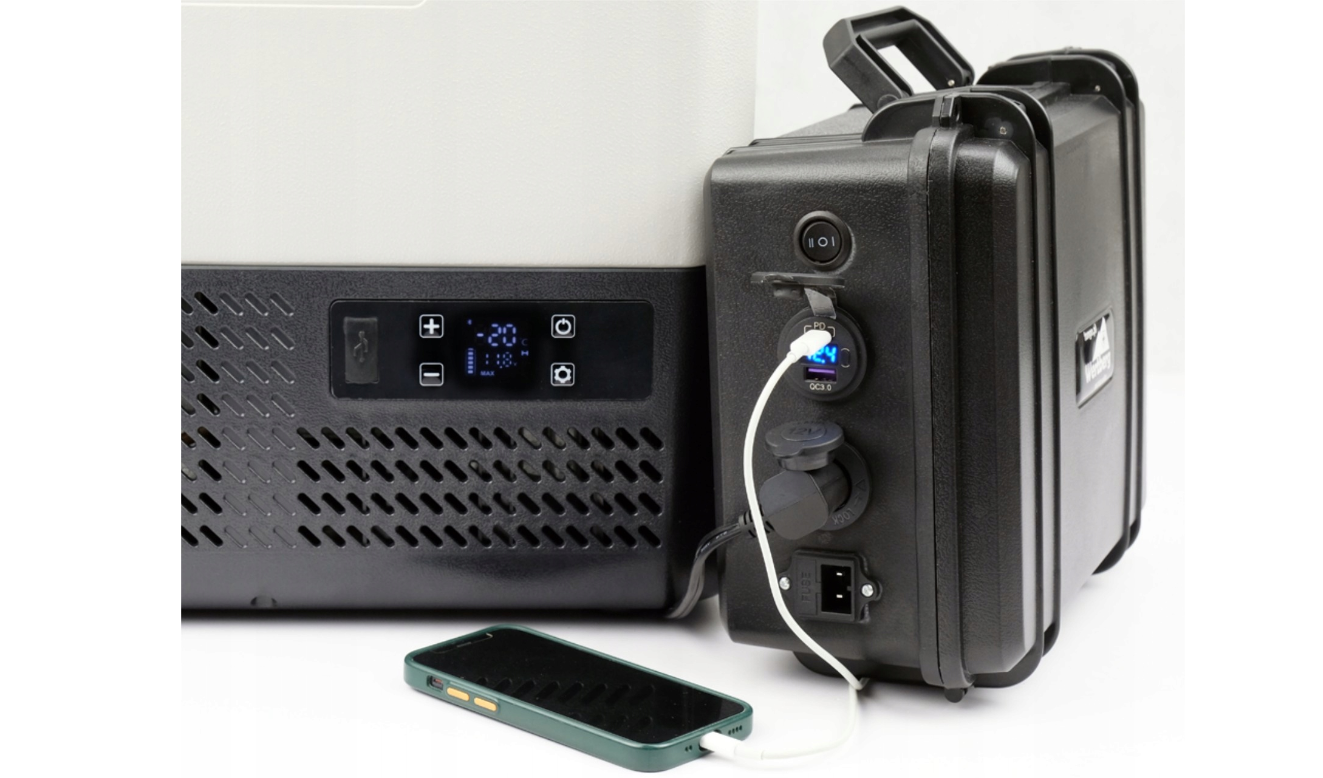 - capacitatea mare (22 Ah) a bateriei integrate permite dispozitivului conectat sa functioneze multe ore; cu consum de curent in timpul suportului de racire (aprox. 2 A) pana la 10 ÷ 11 ore ; in cazul racirii/congelarii intensive (aprox. 4 A) pana la cca 5 ore