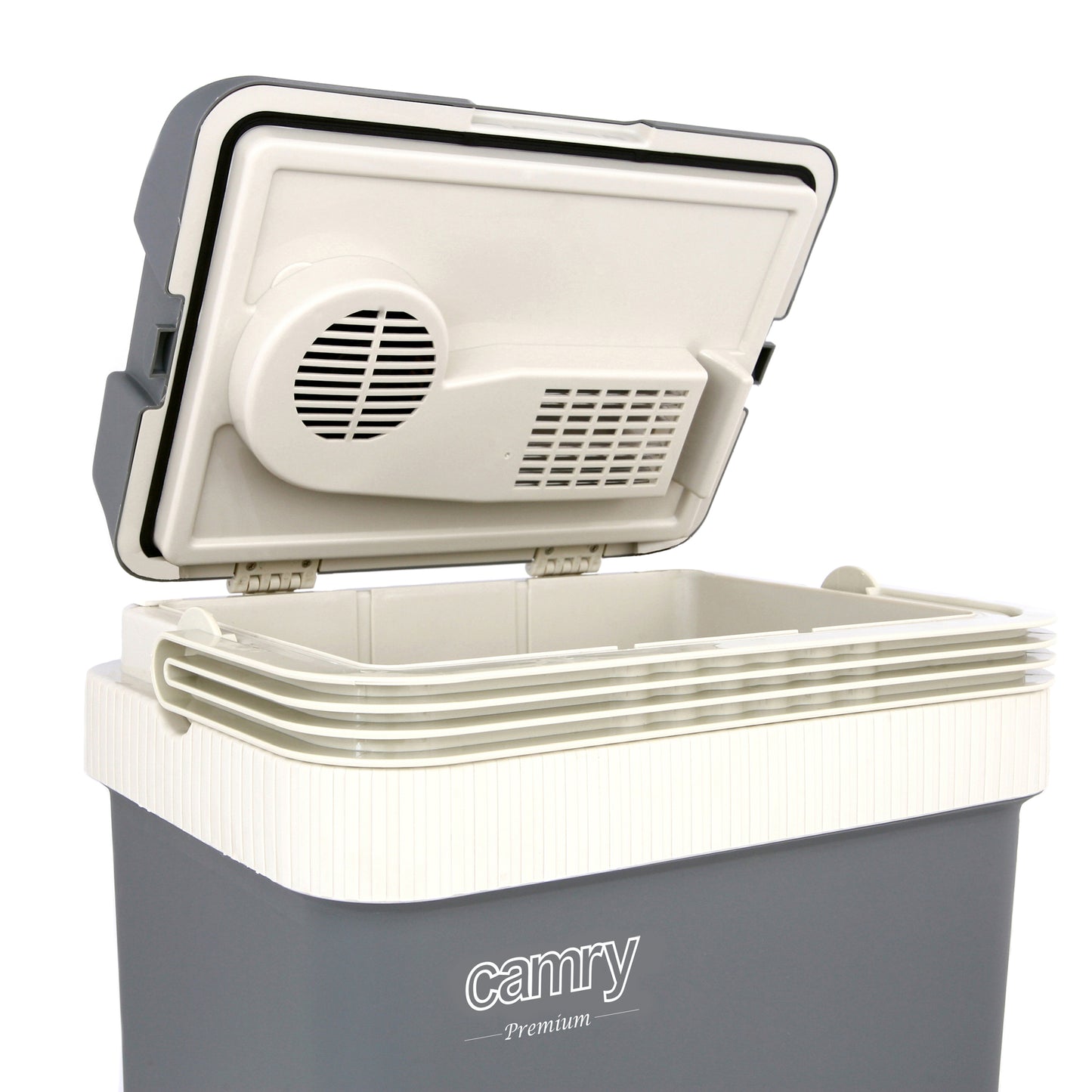 Creat pentru calatorii carora chiar si atunci cand fac camping le place sa bea cateva bauturi reci cu ei. Frigiderul auto portabil are capacitatea de 24l. Este inchis cu zavoare la indemana pentru blocarea ferma a capacului. Datorita izolarii termice speciale a carcasei sale, este posibil sa se mentina o temperatura constanta. Este instalat un maner ergonomic, pliabil, care poate fi ascuns in capacul sacului termic. Cand este inchis, racitorul si incalzitorul masinii devin o carcasa alba la indemana, care arata atat de frumos, cat si comod in transport.