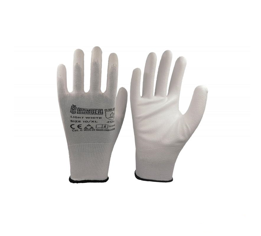 Manusi subtiri din poliester, acoperit pe palma cu un strat de poliuretan alb.