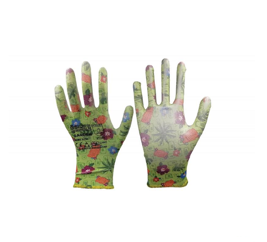 Manusi de gradina tricotate acoperite cu un strat neted de poliester cu un model floral pe palma si degete.