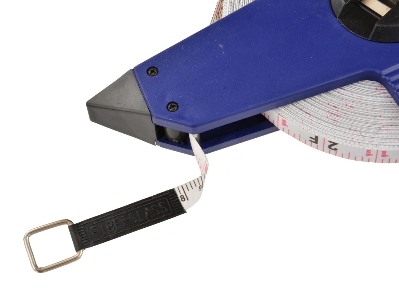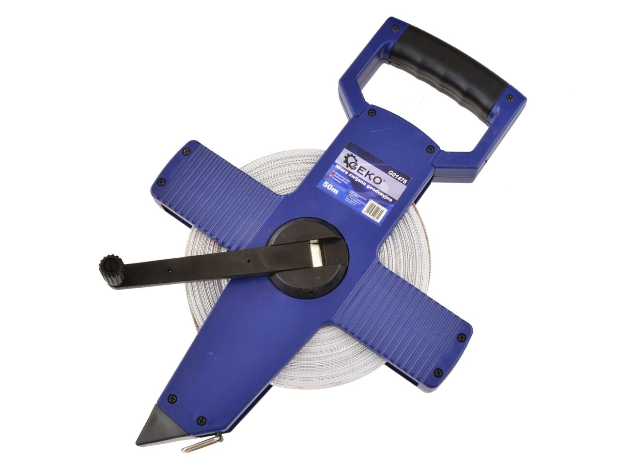 Banda de masurare geodezica de 50 m conceputa pentru masurarea distantelor mari in spatii deschise si incaperi inchise. Banda de masurare din fibra de sticla, caracterizata prin durabilitate ridicata si rezistenta la abraziune si decolorare. Partea inferioara a carcasei masurii cu un varf permite masurarea sa fie introdusa in sol si masurarea efectuata de o singura persoana.