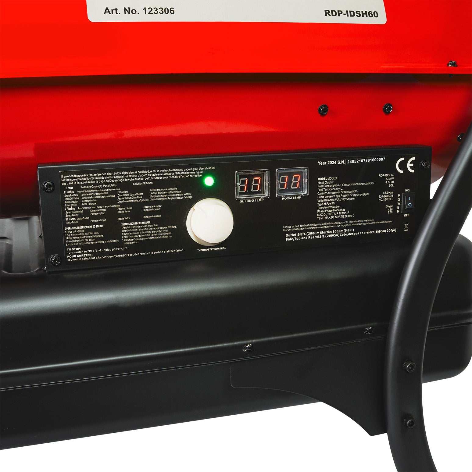 Incalzitor 50kW indirect 50L 4.6L/h 800m³ RDP-IDSH60 este o alegere excelenta pentru cei care cauta o solutie puternica, economica si sigura pentru incalzirea spatiilor mari. Datorita caracteristicilor sale, acest model ofera eficienta ridicata, intretinere usoara si siguranta, facandu-l preferat pentru aplicatii industriale si de constructii.
