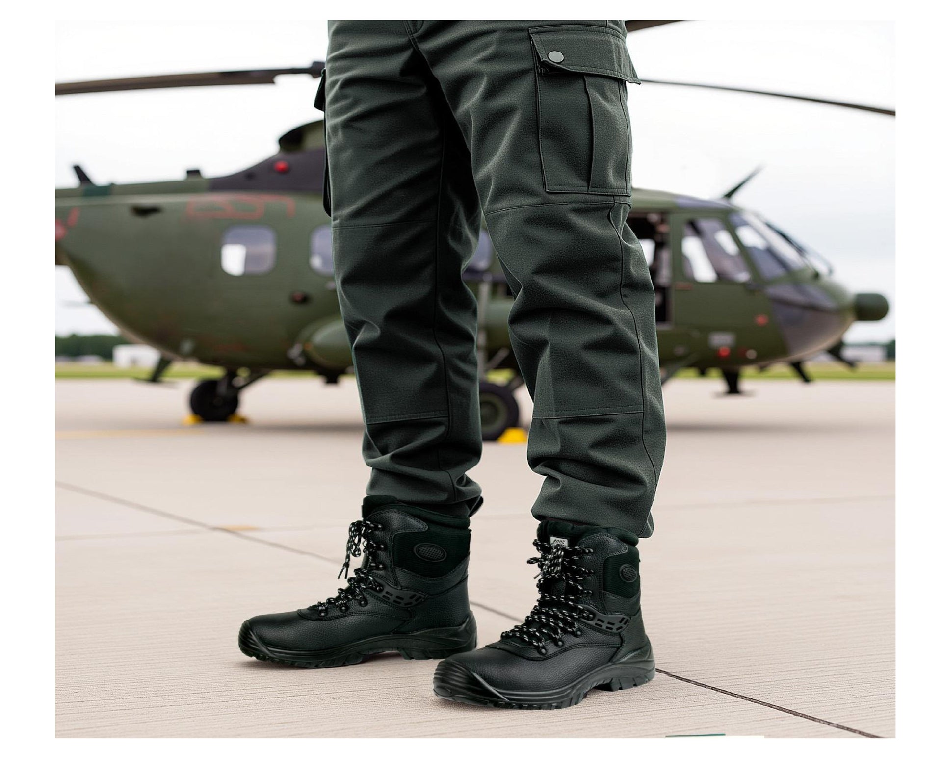 Ghete de protectie izolate, cu un design modern, atractiv, in stil militar-stradal, confectionate din piele de vaca embosata cu grosimea de 1,6-1,8 mm si material textil tehnic din panza impregnata, impermeabila si respirabila.