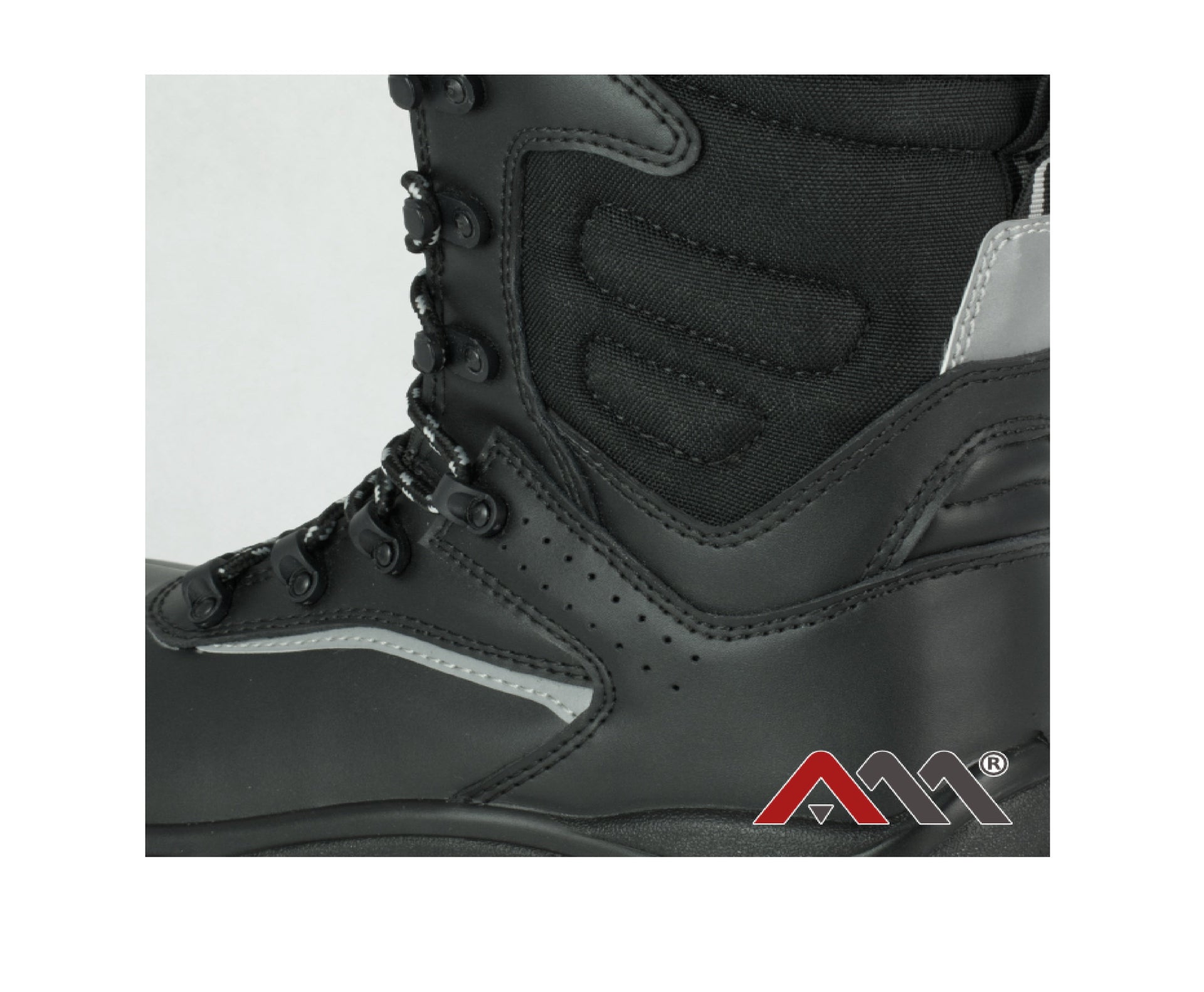 - Partea superioara este confectionata din piele de vaca neagra si material impregnat, impermeabil. Prezinta elemente reflectorizante care sporesc atractivitatea vizuala a incaltamintei. Elementele reflectorizante sporesc vizibilitatea purtatorului, imbunatatind siguranta.