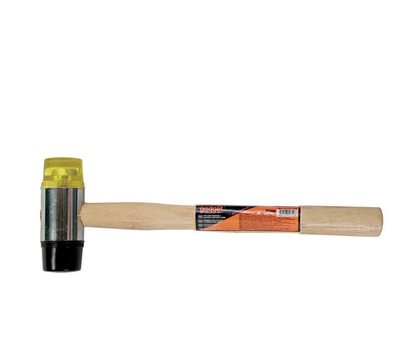 Ciocan din cauciuc si plastic cu maner din lemn.