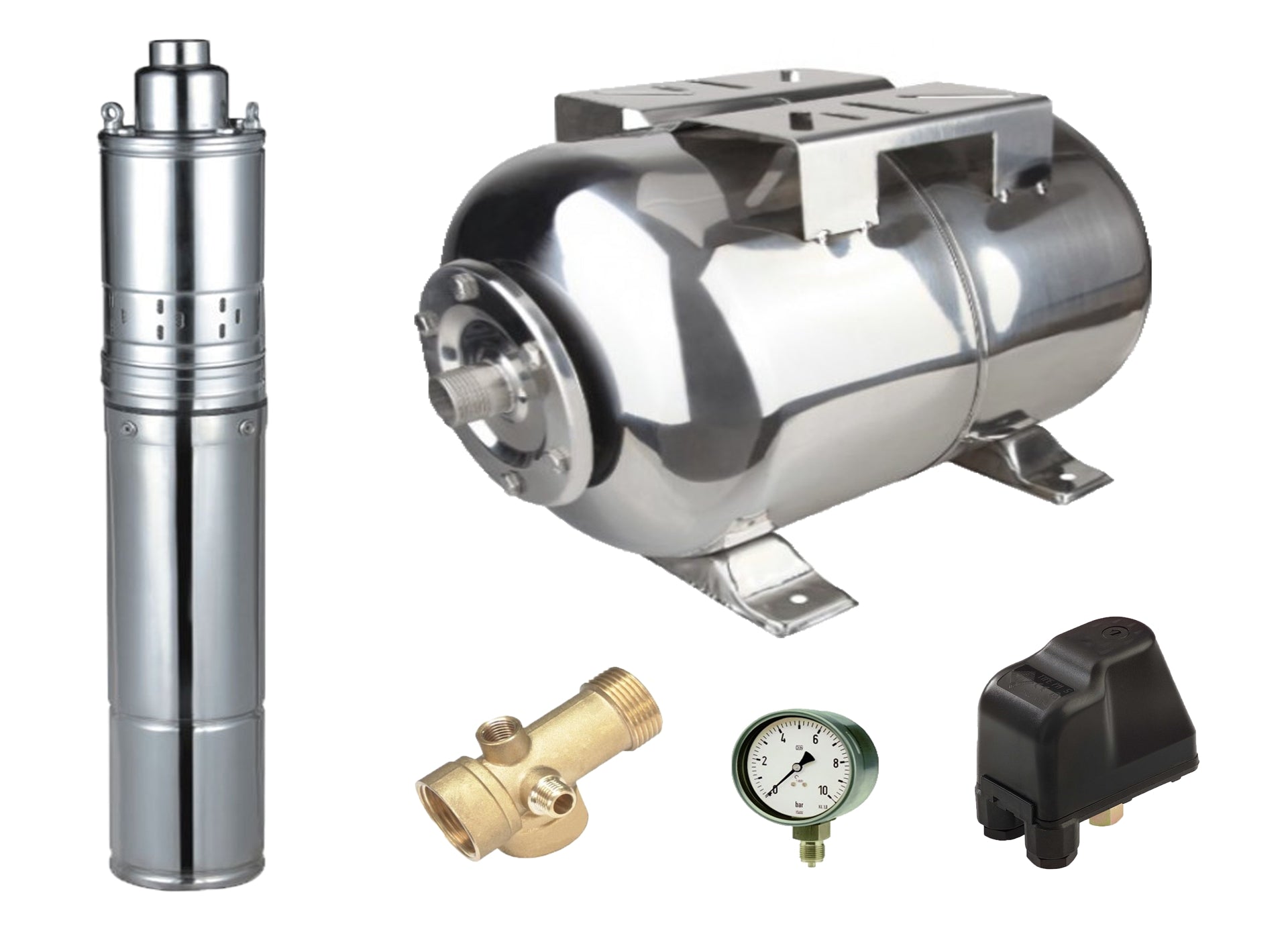 Kit complet sistem hidrofor, pompa submersibila cu surub Maxima 4QGD 0.37/50, rezervor de 50 litri din inox, presostat, racord 5 cai, manometru