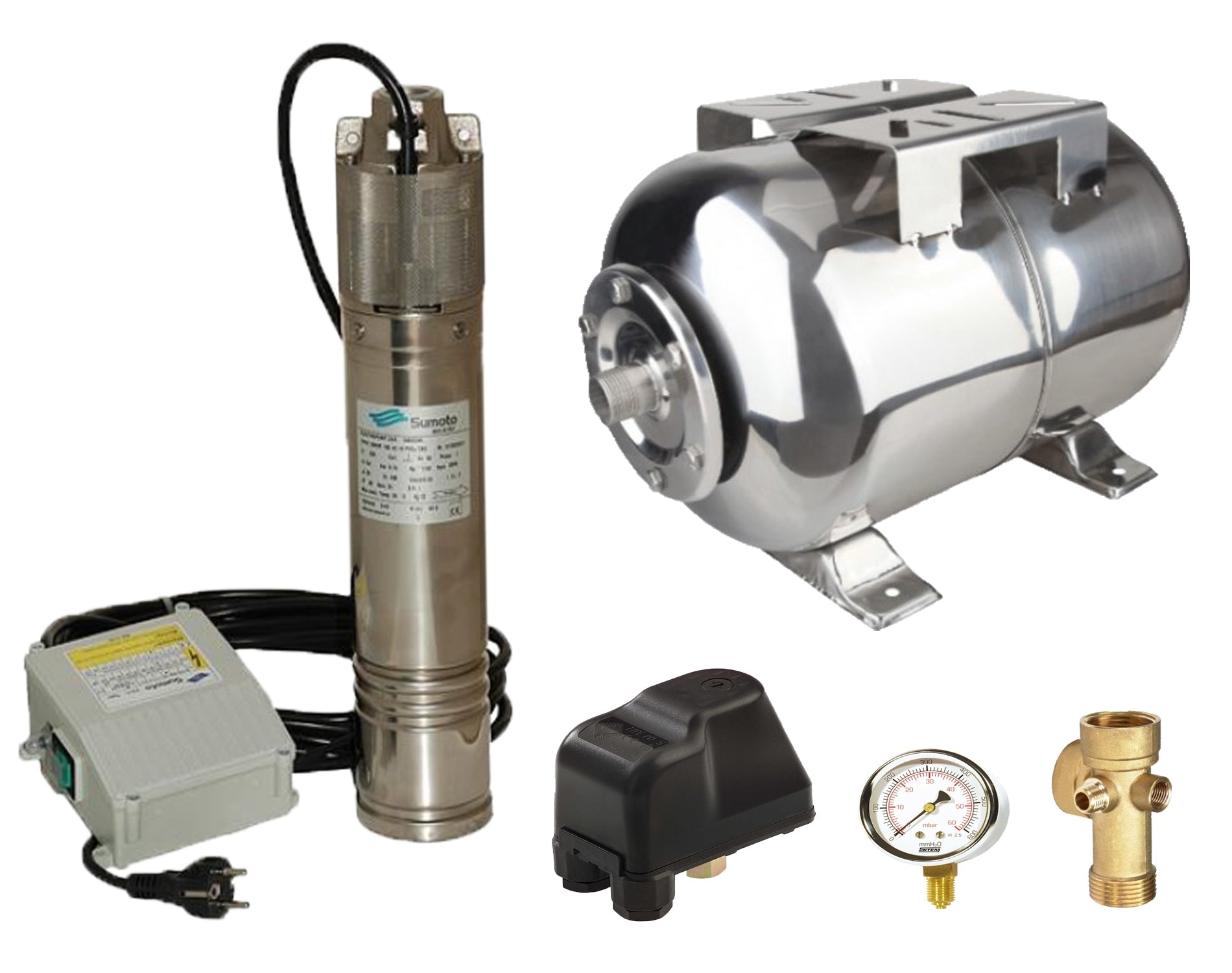 Kit complet sistem hidrofor, pompa submersibila SUMOTO ONKM150/50, rezervor de 50 litri din inox, presostat, racord 5 cai, manometru, SM0071/50I