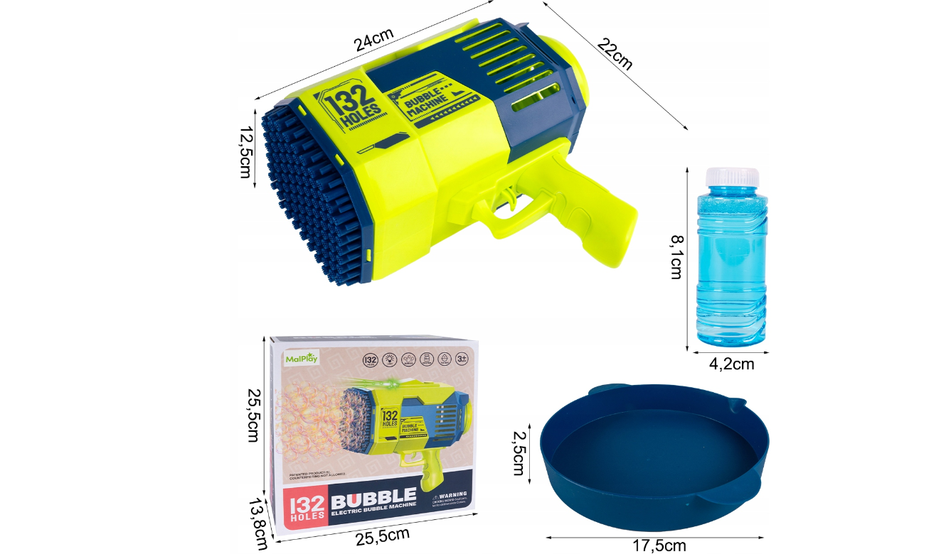 Baloanele de sapun sunt jocul preferat al copiilor mici si mari. O masina fantastica pentru a face bule de sapun in forma de super bazooka va aduce multa bucurie fiecarui copil. Admira zeci de bule de sapun curcubeu care plutesc in aer.