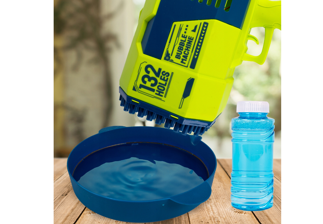 Turnati lichidul in recipientul inclus in kit si apoi scufundati gaurile de pe partea din fata a pistolului in el. Apasati declansatorul bazooka si gata! Din acest moment, va puteti bucura de privelistea unor bule frumoase, curcubeu, care plutesc in aer, care ies din 32 de gauri simultan!