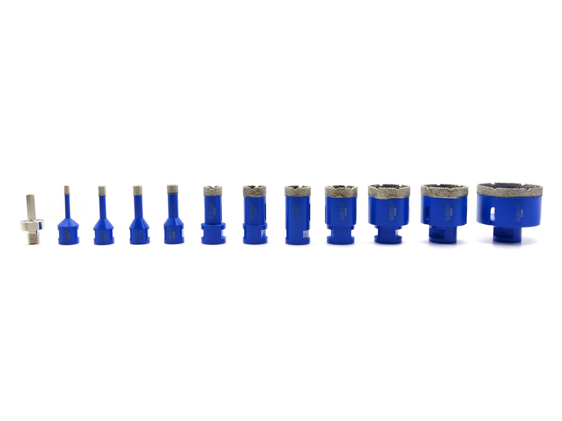 Carota cu găuri de diamant setat în dimensiuni de la 6 la 68 mm Echipat cu un filet de montare M14 pentru montarea în polizoare unghiulare. Perfect pentru a face găuri în materiale precum gresie, plăci ceramice, plăci și piatră naturală. Carota cu găuri de dimensiuni de la 6 la 12 mm au fost turnate din interior cu ceară care primește căldură, împiedicând supraîncălzirea acesteia. Cu toate acestea, ar trebui să vă amintiți să scoateți materialul excavat din carota în mod continuu.