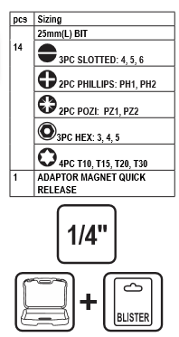 Set 15 biti si suport magnetic, insertie de 1/4''.