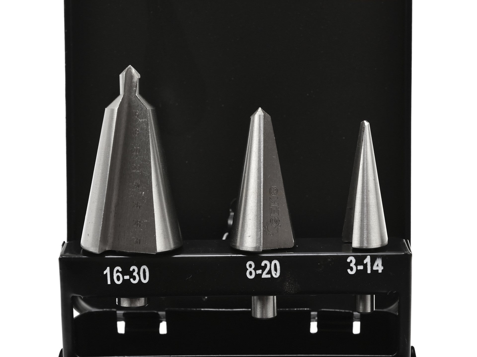 Set de burghie conice continuu in dimensiunile 3-14, 8-20 si 16-30mm. Burghie cu suport cilindric. Fabricat din otel HSS. Va permit sa gauriti perfect gauri rotunde in otel, alama, cupru, aluminiu, lemn si plastic.