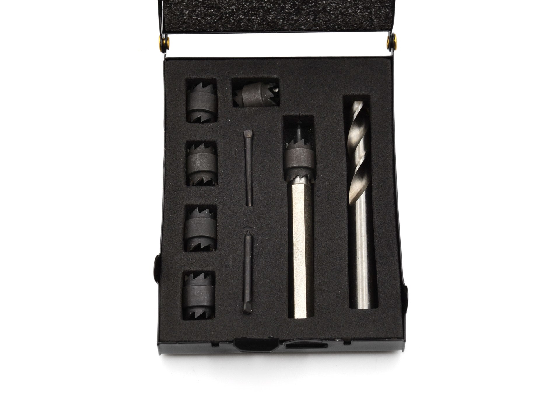 Kit pentru indepartarea rapida a sudurilor la punct. Include sase freze cu doua fete, trei biti de centrare pentru gaurire mai precisa, un mandrin de prindere si un burghiu special HSS de 8 mm. Totul este ambalat intr-o carcasa practica din metal.