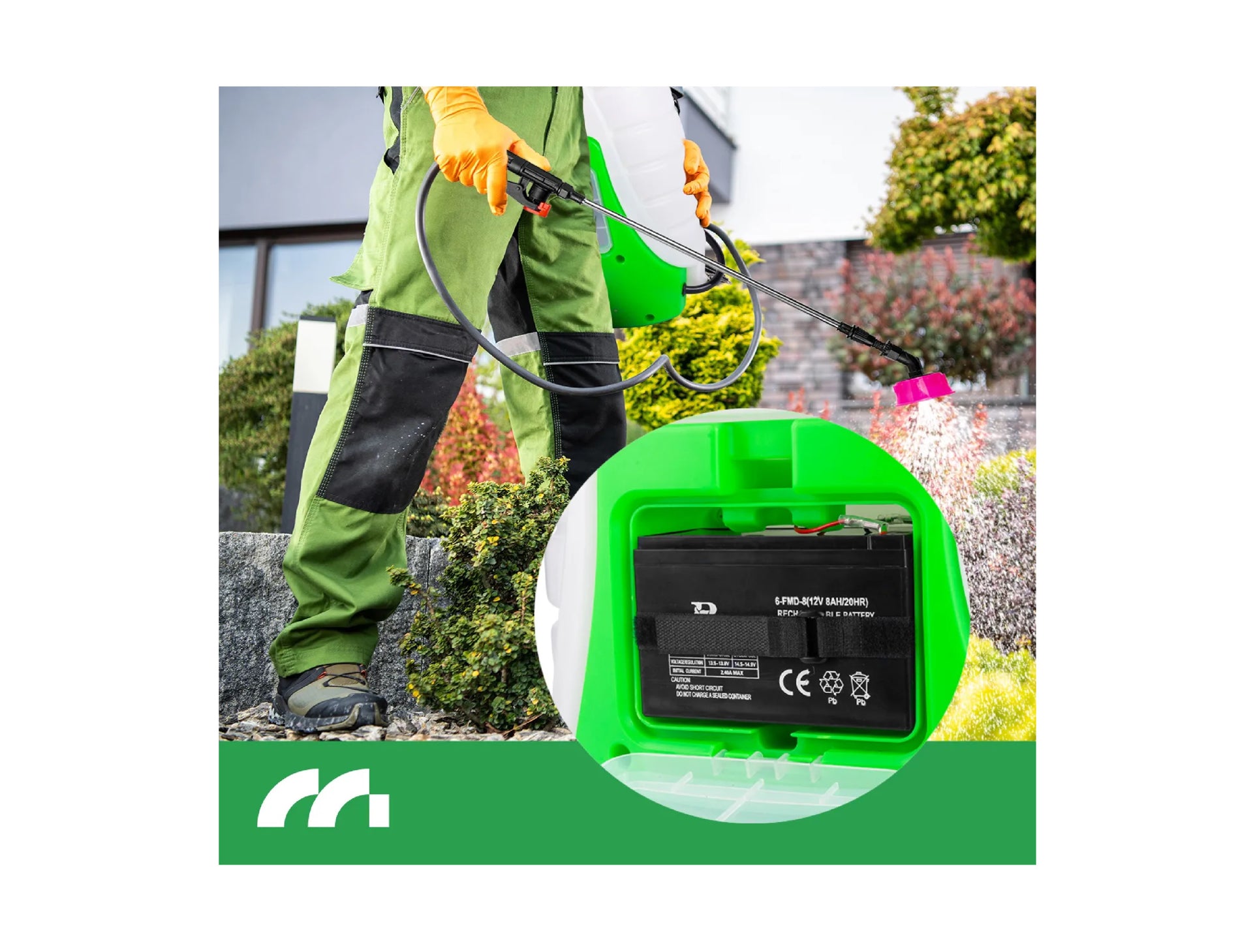 Bateria incorporata de 12V - 8AH permite o functionare indelungata fara intrerupere. Acesta este un mare avantaj in comparatie cu pulverizatoarele manuale care necesita pompare constanta. Setul include un incarcator care va permite sa incarcati cu usurinta bateria, astfel incat sa fie intotdeauna gata de utilizare.