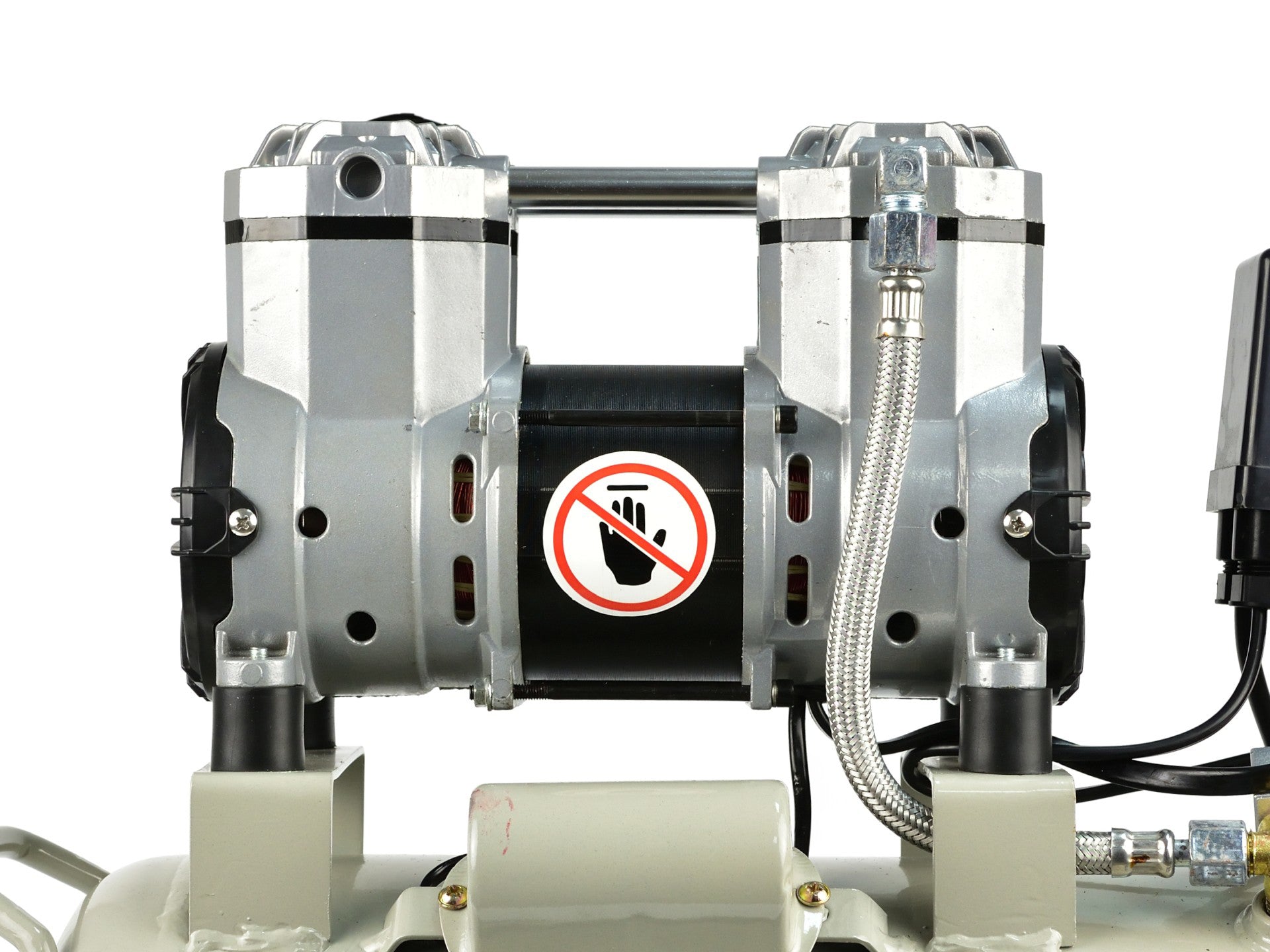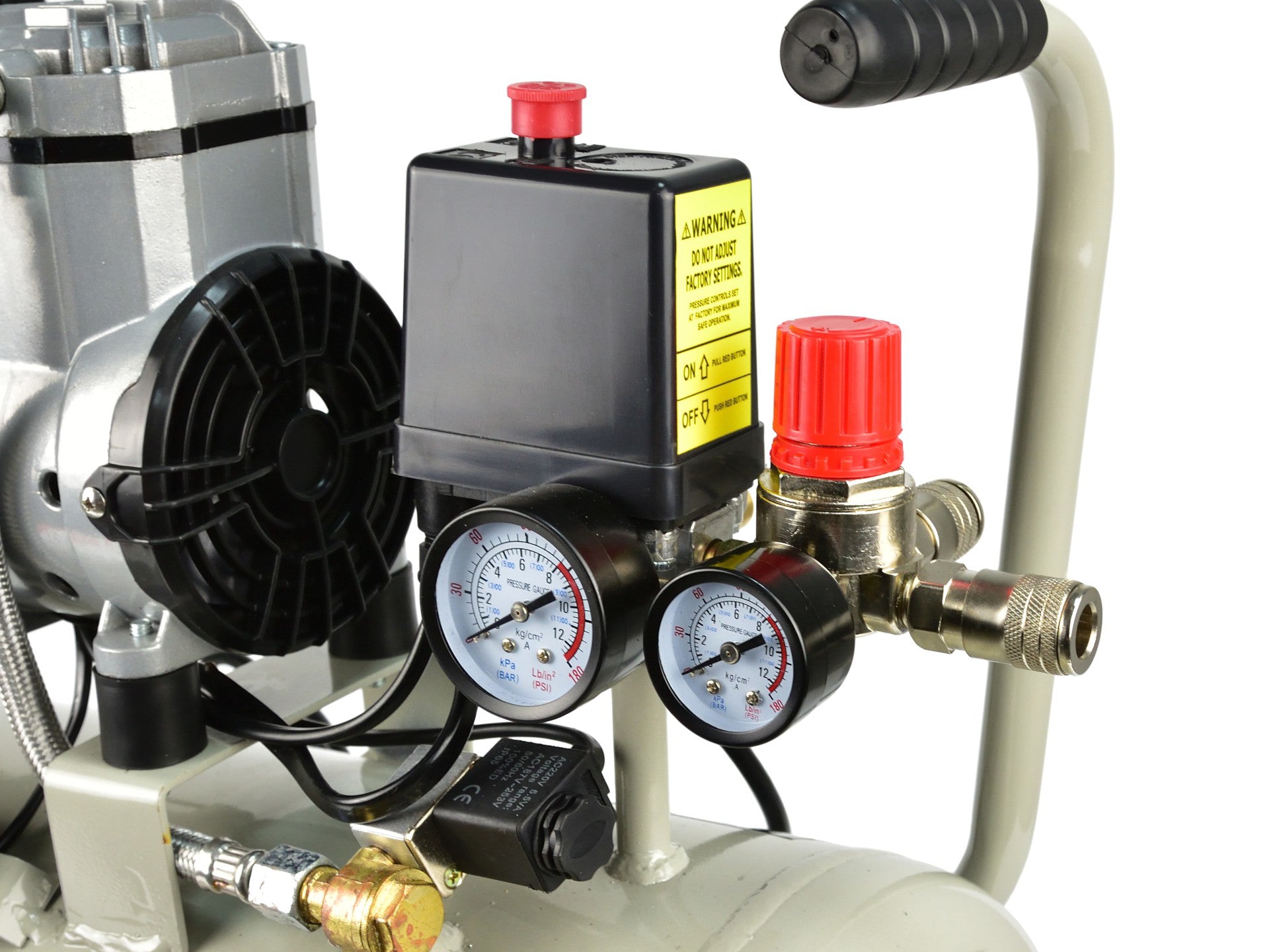 Compresorul este echipat cu o pompa fara ulei , potrivita pentru functionare pe termen lung. Complet cu un manometru care arata presiunea din rezervor si un reductor de presiune cu un manometru cu care puteti seta presiunea de iesire si o puteti citi. Compresoarele fara ulei se caracterizeaza printr-o cultura de lucru mult mai mare in comparatie cu compresoarele cu ulei traditionale. Este recomandat in special pentru utilizare acolo unde aerul comprimat nu poate fi contaminat cu ulei.