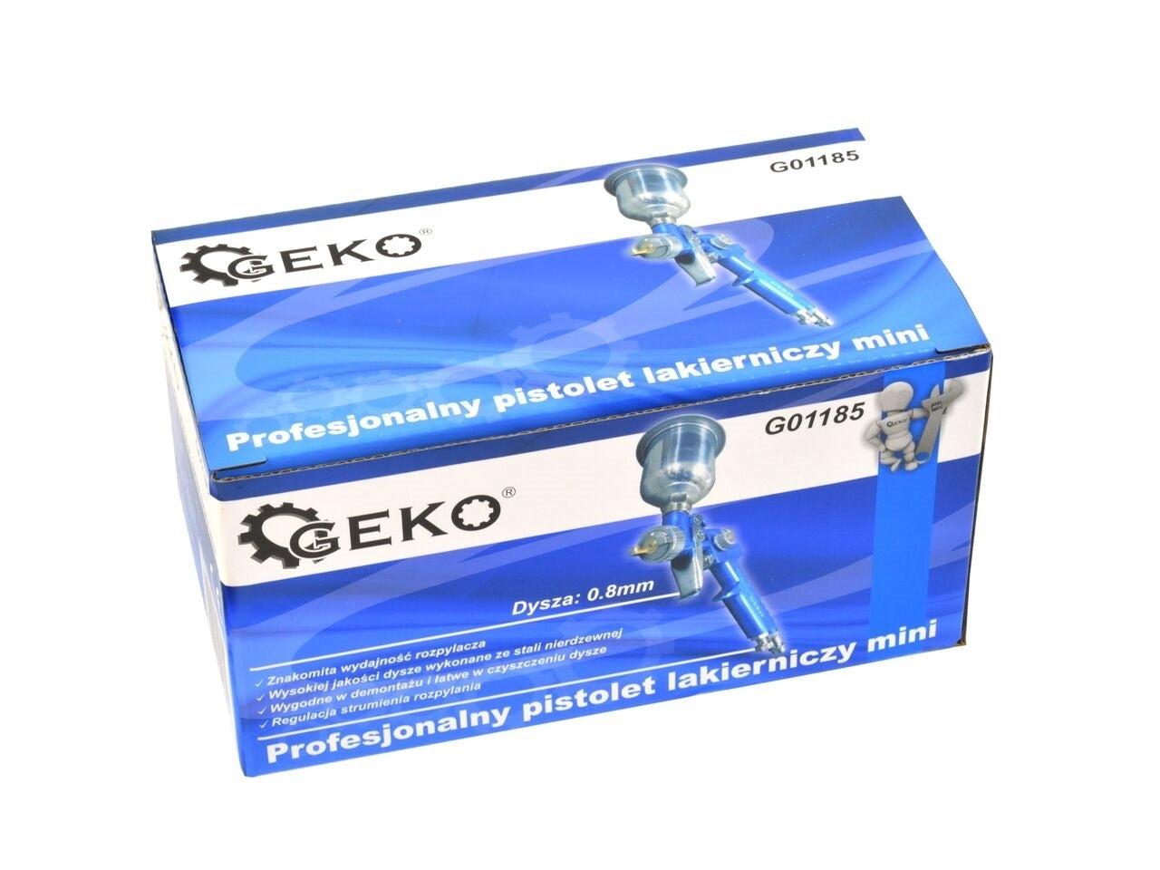 Tehnologia aplicata HVLP (High Volume Low Presure) permite obtinerea unui volum mare de vopsea ejectata cu o presiune redusa a aerului impingand vopseaua prin duza. Ca urmare, se pierde mai putina vopsea cu aerul suflat si mai multe ploi pe suprafetele vopsite, ceea ce reduce consumul de vopsea. Pistolul este echipat cu un rezervor gravitational superior cu o capacitate de 150 ml. Duza rotativa va permite sa modificati forma fluxului de vopsea.