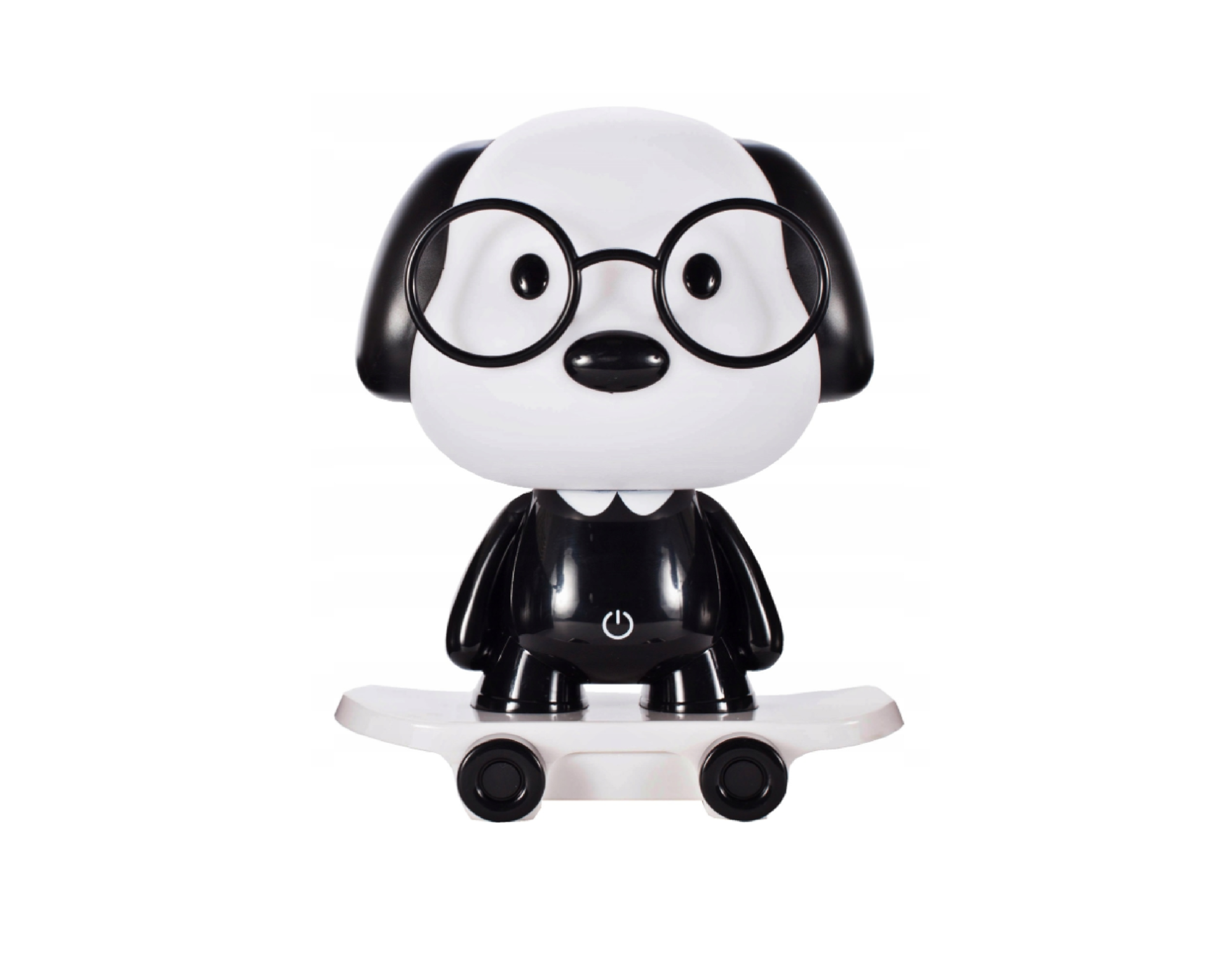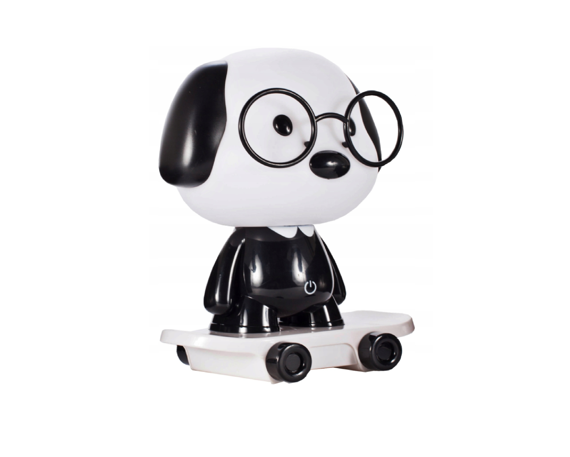 O lampa draguta de noptiera pentru o camera de copii in forma de caine pe un skateboard. Datorita unei astfel de lampi, copilul va adormi mai calm si mai repede, iar lumina care emite nu va deranja nimic.