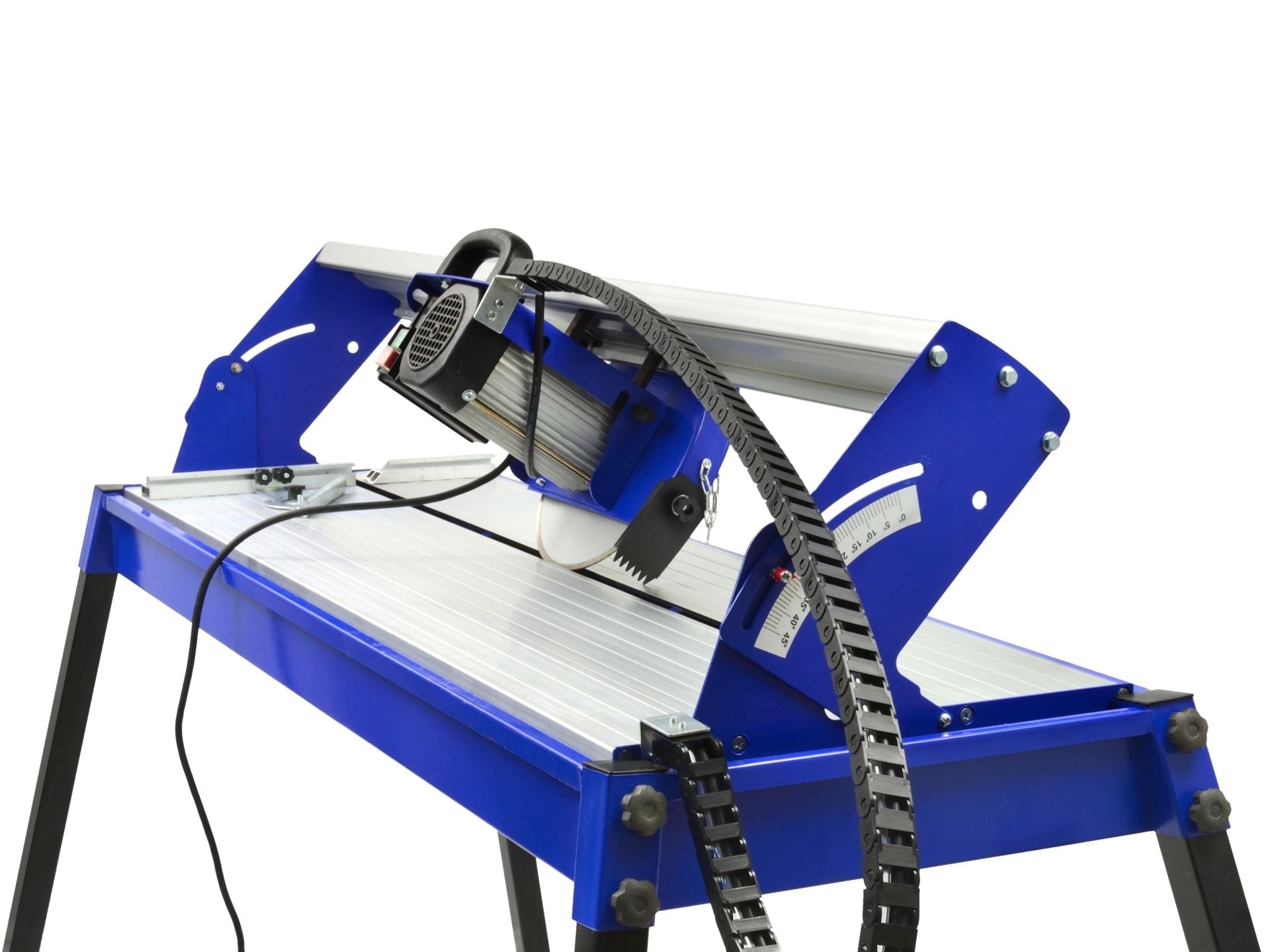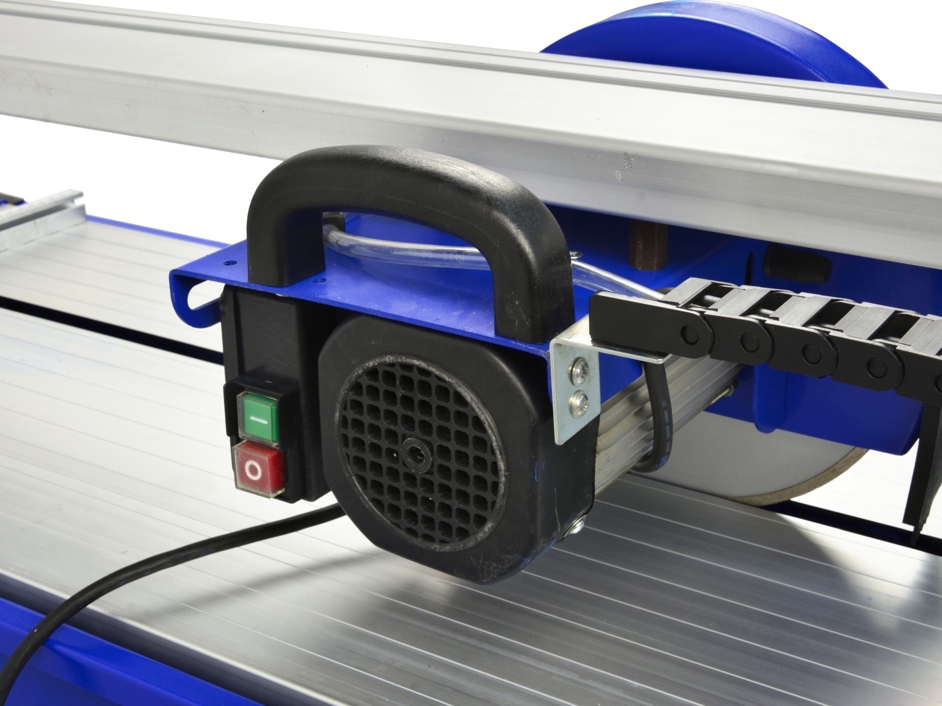 Caractericticile produsului: masa mare de lucru din aluminiu vă permite să tăiați până la 900 mm lungime, pompa electrică de apă oferă un control excelent și un debit de apă pentru a asigura tăierea și răcirea fără de praf a lamei, tăierea cu o lamă de diamant cu un diametru de 230 mm, design durabil din oțel inoxidabil și aluminiu, poziționer pentru tăierea plăcilor de-a lungul diagonalei.