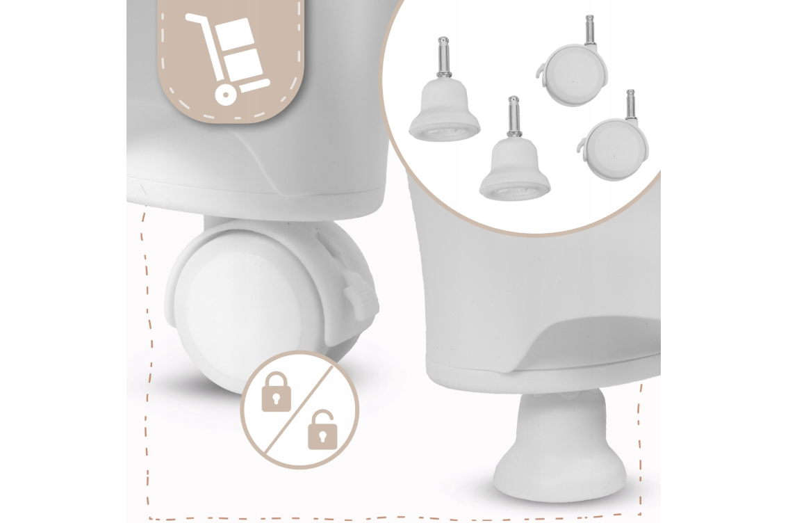 Scaunul inalt DELI se pliaza rapid si intuitiv - nu necesita unelte. Odata pliat, ocupa un spatiu minim, fiind usor de depozitat sau de luat cu tine in deplasare. Rotile din spate iti permit sa muti cu usurinta scaunul prin casa fara a-l ridica.