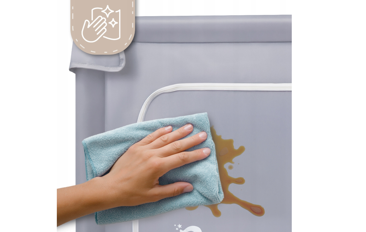 Toate componentele textile ale tarcului pot fi curatate cu o laveta umeda si, dupa scoaterea din cadru, spalate manual . Constructia este rezistenta la utilizarea zilnica: