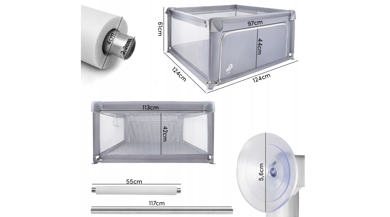 * Nota: Dimensiunile interne pot varia usor in functie de locatia masuratorii (sus sau jos) si de intinderea materialului. Datorita elasticitatii materialului, partea de jos a tarcului de joaca poate gazdui cu usurinta un covoras de joaca standard de 120 x 120 cm.