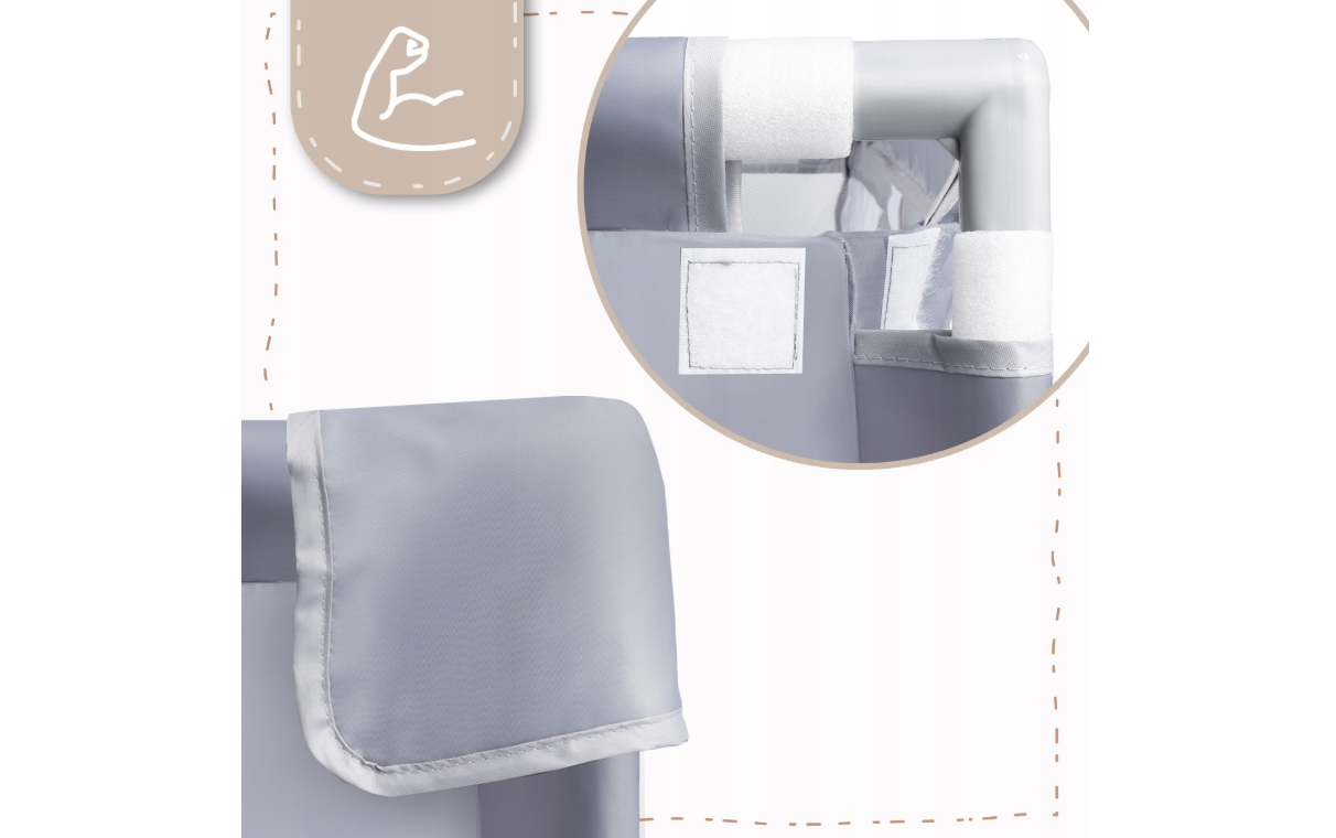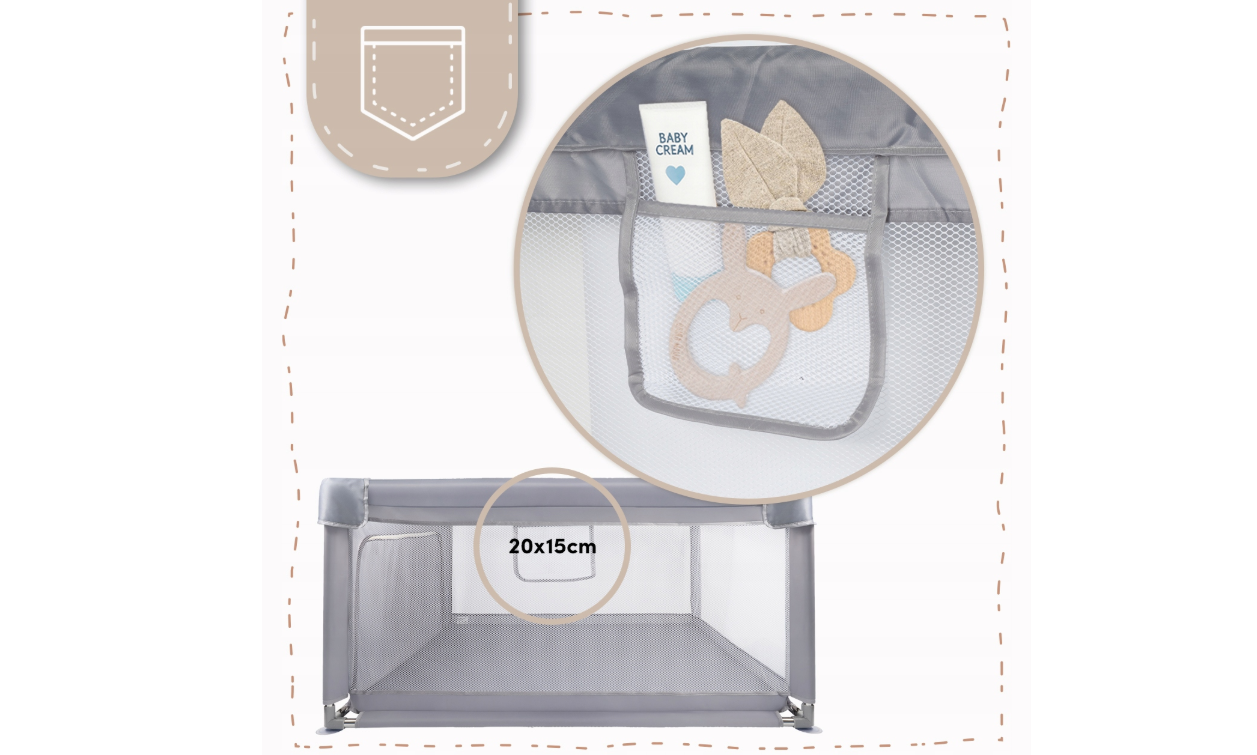 Tarcul de joaca KIVO are un buzunar practic din plasa pe unul dintre peretii laterali. Materialul transparent va permite sa vedeti cu usurinta continutul buzunarului, permitand acces rapid la obiecte esentiale precum crema pentru bebelusi, jucarii de dentitie sau jucarii mici. Aceasta solutie convenabila va ajuta sa ramaneti organizati si sa aveti toate lucrurile esentiale mereu la indemana.