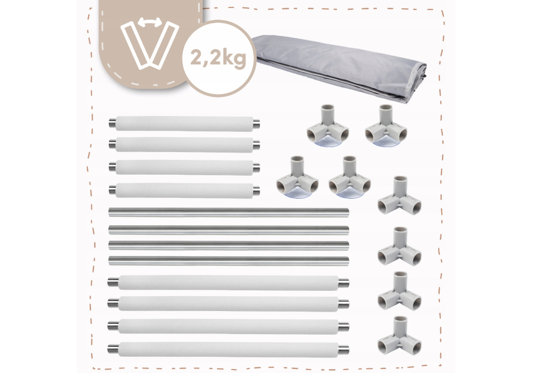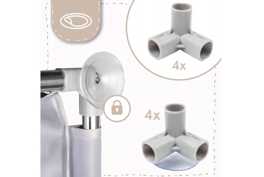 Sistemul de pliere al tarcului KIVO se bazeaza pe un mecanism simplu, fara unelte. Pur si simplu conectati componentele cadrului si intindeti husa din material textil - totul conform instructiunilor ilustrate incluse. Ventuzele adauga stabilitate tarcului, iar asamblarea si dezasamblarea nu necesita forta sau unelte speciale.