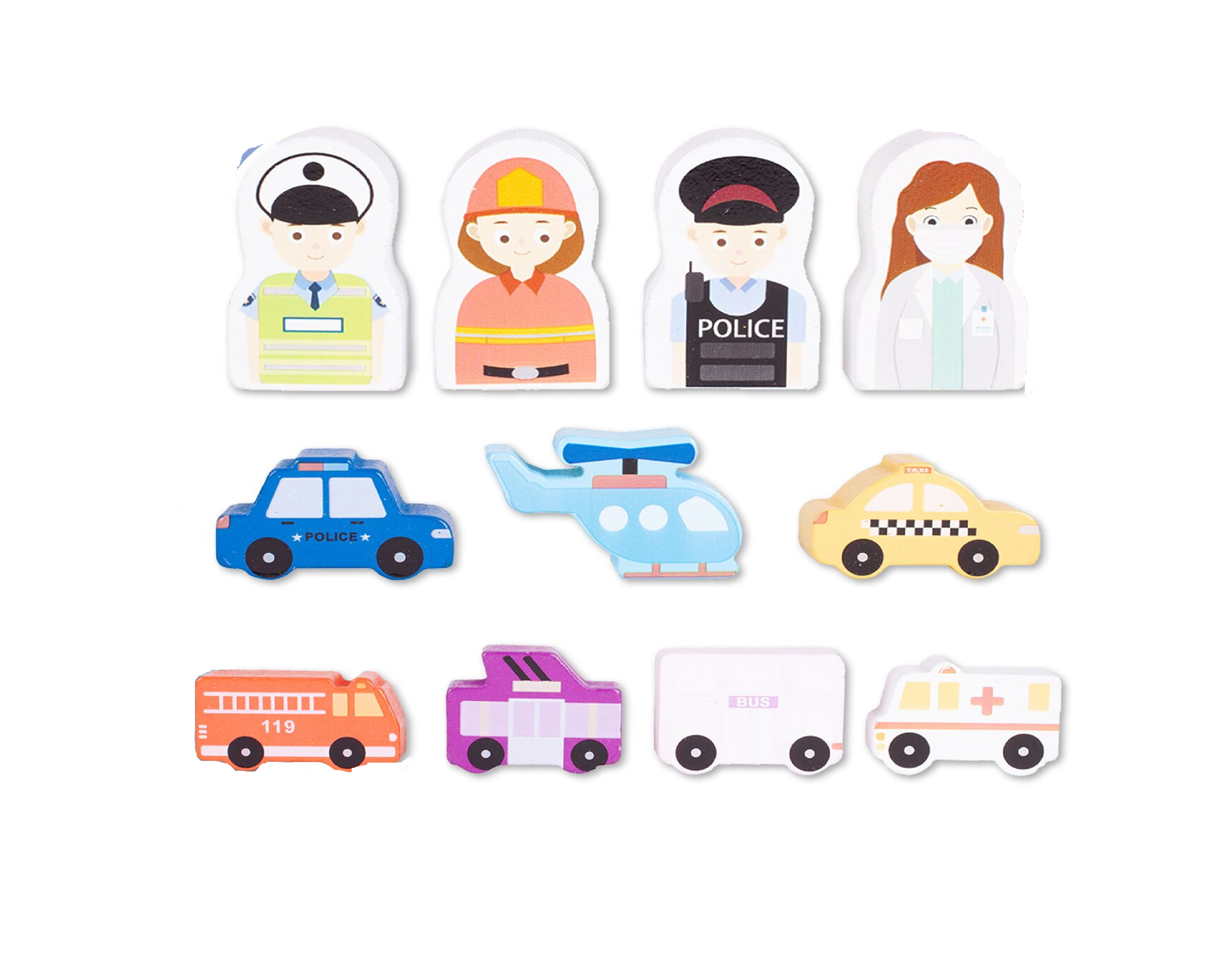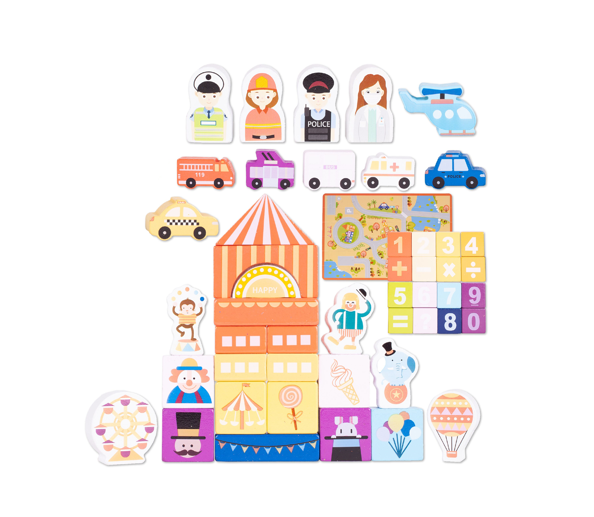 Setul format din 184 de blocuri de lemn diferite permite amenajarea variata a spatiului si va permite sa construiti un oras de vis, din care sa nu lipseasca cladirile, de ex. politie, pompieri si magazine.