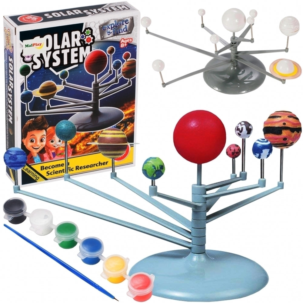 Sistemul planetar pentru auto-asamblare este o propunere interesantă pentru fiecare copil. Sistemul nostru solar este extrem de interesant, un copil poate învăța multe despre universul nostru prin joc. Planetele vin în alb la fabrică, astfel încât fiecare copil să le poată vopsi în propria imaginație. Acest lucru va permite copilului să-și dezvolte creativitatea și să-și îmbunătățească abilitățile manuale. Pe fiecare braț este scrisă distanța în mile de planetă de soare.Setul include și un mic șmirghel, cu care ar trebui să ștergeți planetele înainte de a vopsi. Acest lucru va facilita lipirea vopselei.
