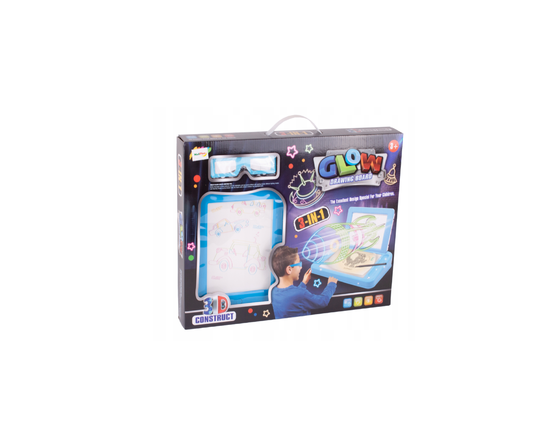 2. Copilul poate folosi doar o placa mica - dupa ce a pornit a doua tabla, mai mica, incepe sa straluceasca in culoare! Tot ce trebuie sa faceti este sa puneti pe ea o bucata de hartie cu imagini colorate si sa incepeti sa desenati forme cu markere fluorescente. Apoi pune-ti ochelarii si imaginile vor fi vizibile in 3D! Placa are atasate ventuze, asa ca o putem agata, precum si picioare pentru a sta in picioare.