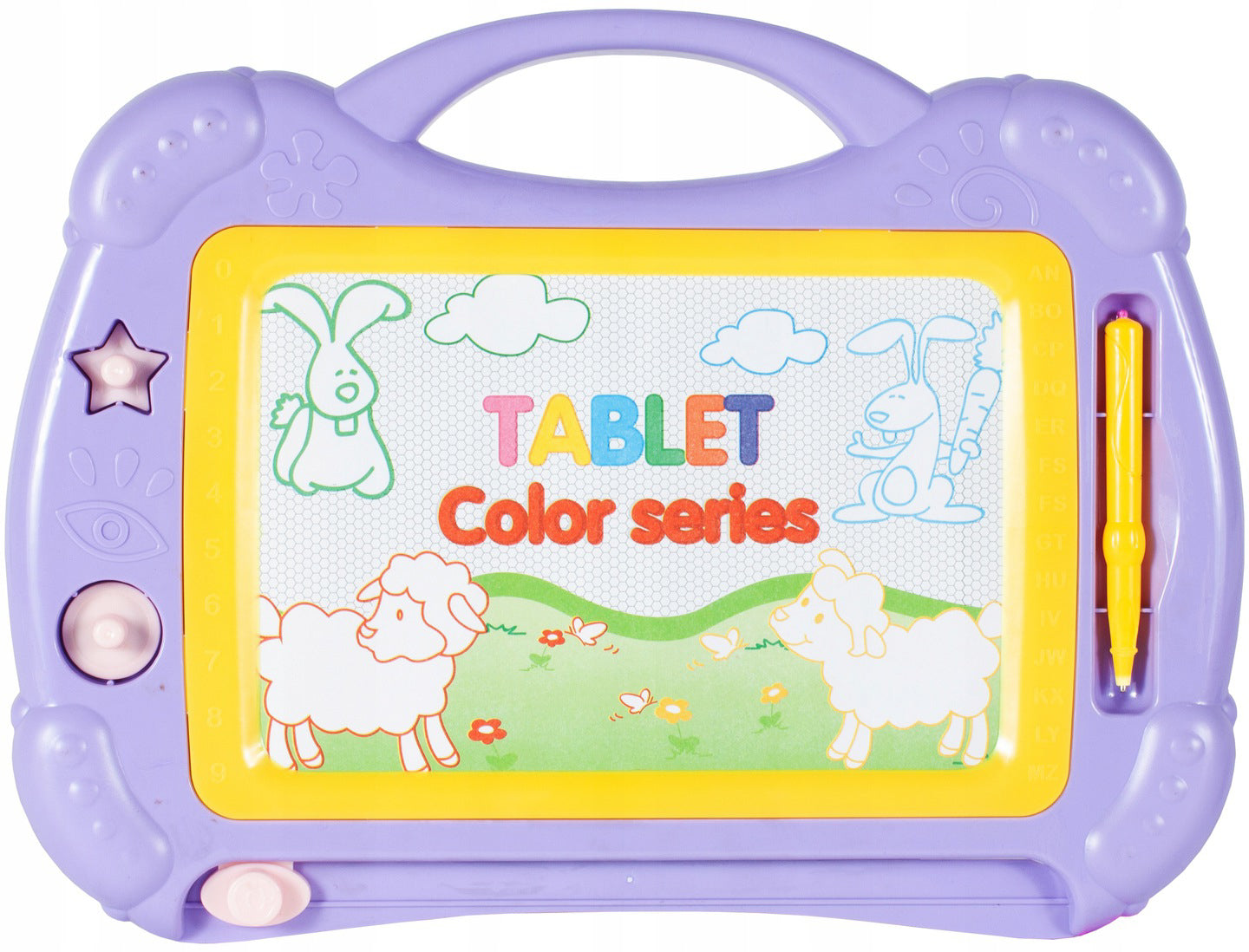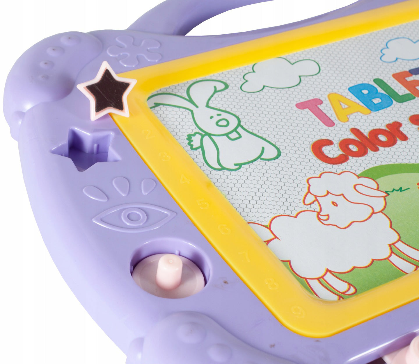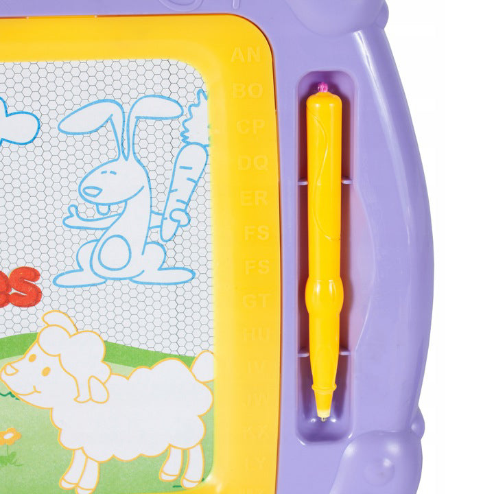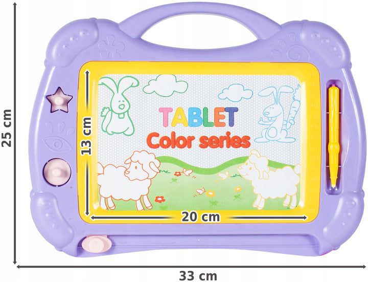 Placa este realizata din punct de vedere estetic din materiale de înalta calitate. Exista un maner practic langa tabla, datorita caruia copilul dvs. va putea lua jucaria oriunde doreste. Puteti scrie pe tabla magnetica cu un stilou special, dupa care veti vedea inscriptii colorate. Acest fundal colorat va face jocul mult mai interesant. Distractia suplimentara este oferita de stampile care pot fi imprimate peste tot. Dupa ce ati terminat de jucat, folositi doar glisorul din partea de jos a placii, mutati-l si întreaga imagine va disparea.