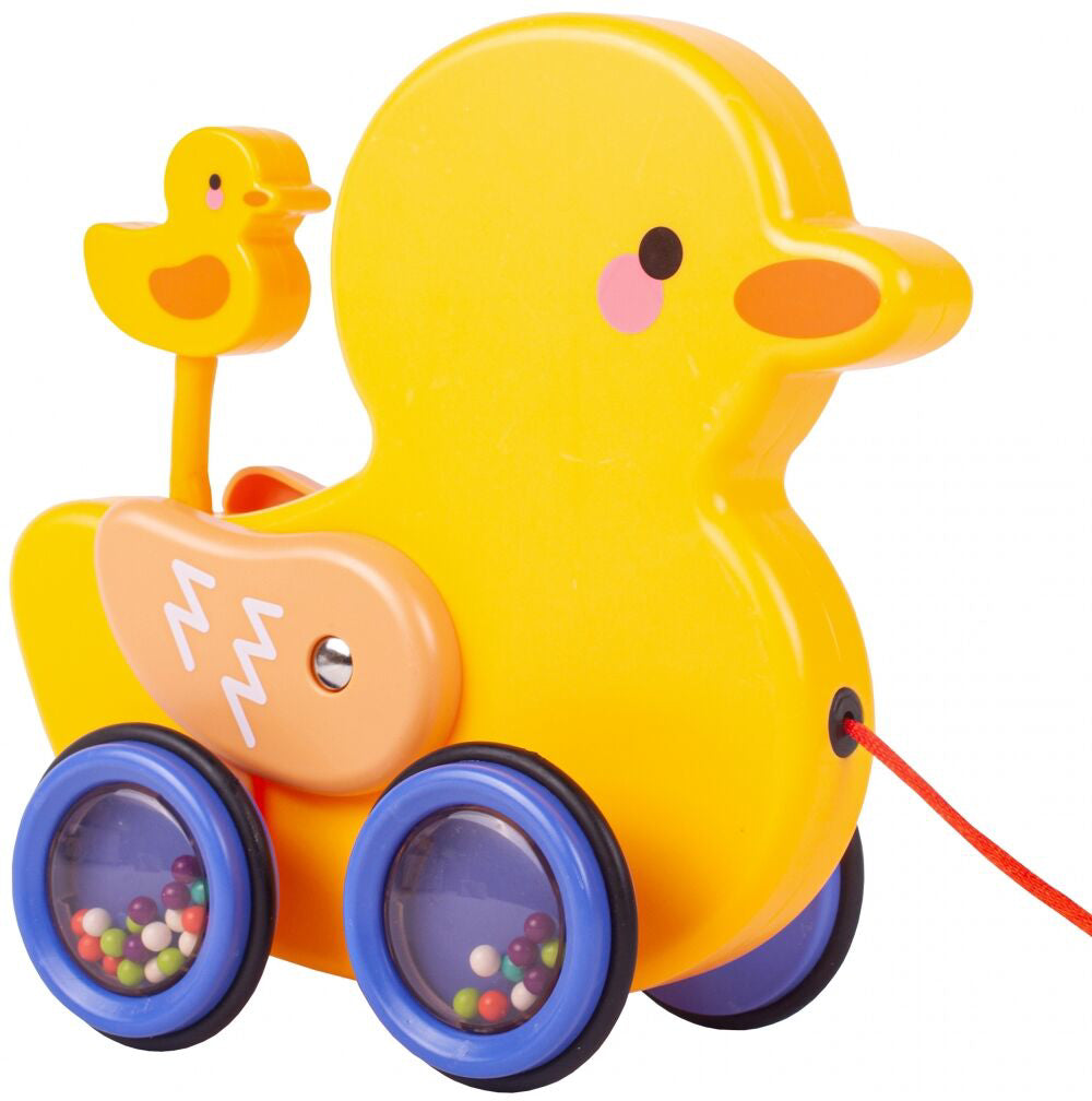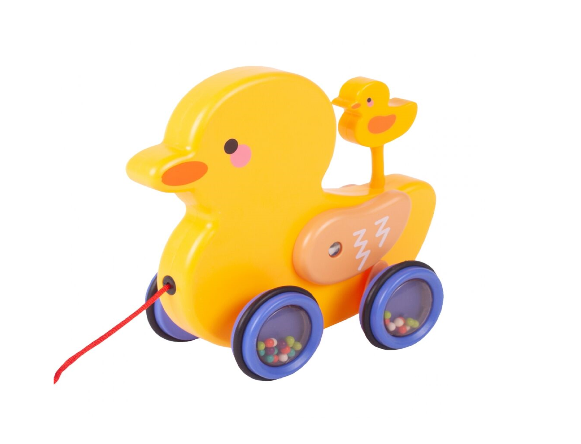 In roti sunt bile colorate care zdranganesc in timpul mersului, ceea ce starneste interesul copilului.In timpul plimbarii, rata sare bucuroasa in sus si aripile ii misca. Are o coada mobila