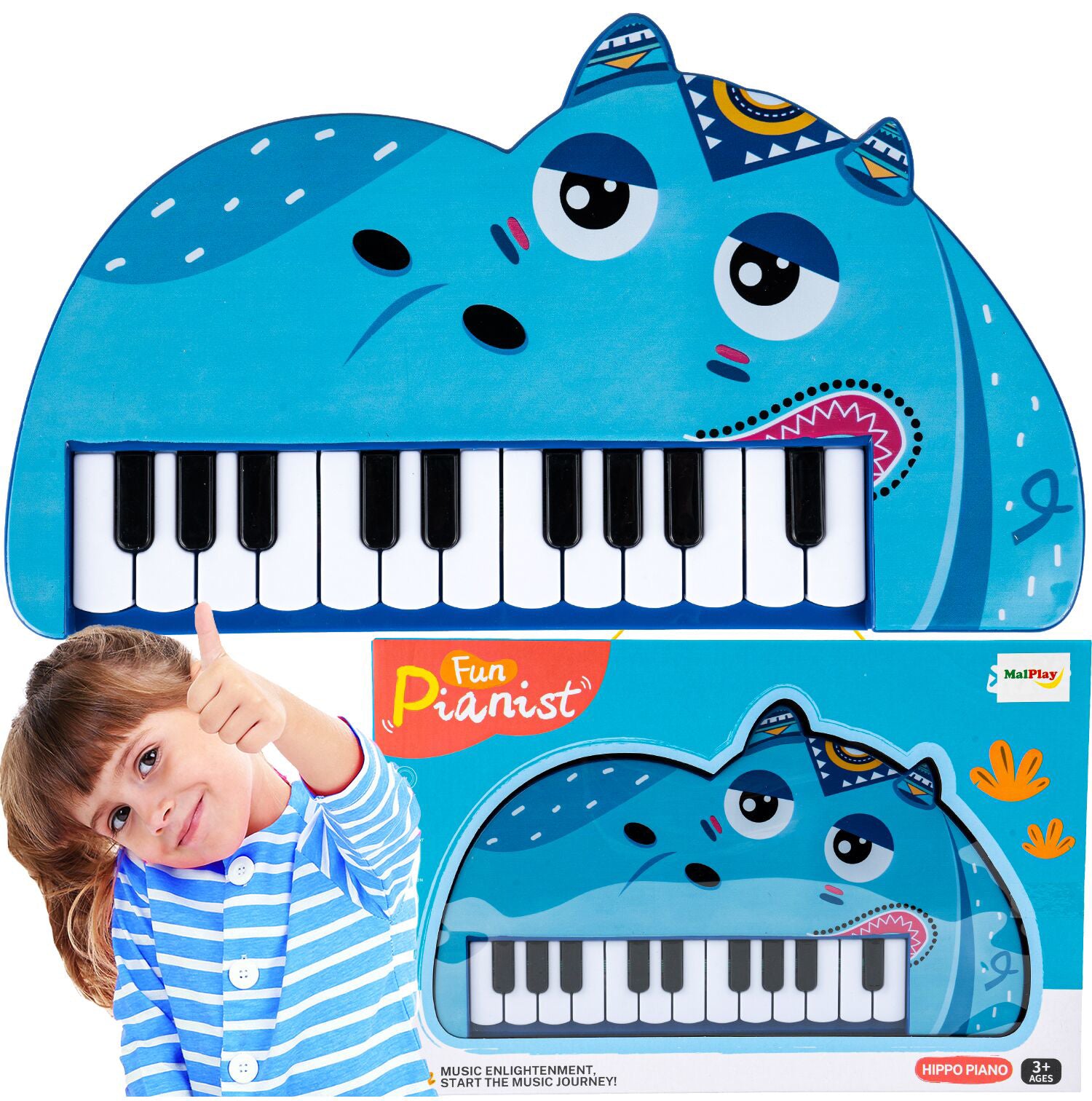 Pianul are forma unui hipopotam dragut albastru ambalat intr-o cutie, facandu-l perfect pentru un cadou.