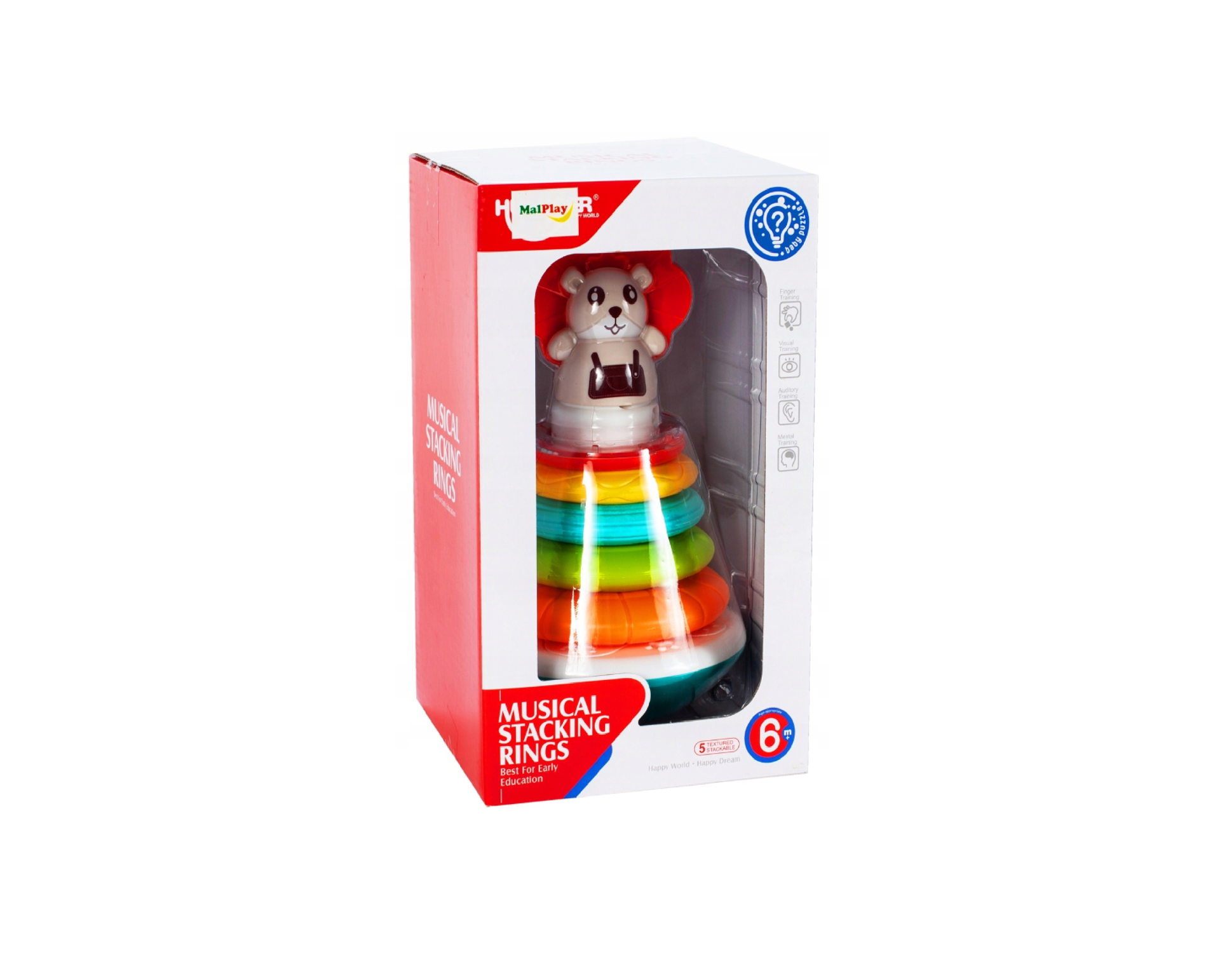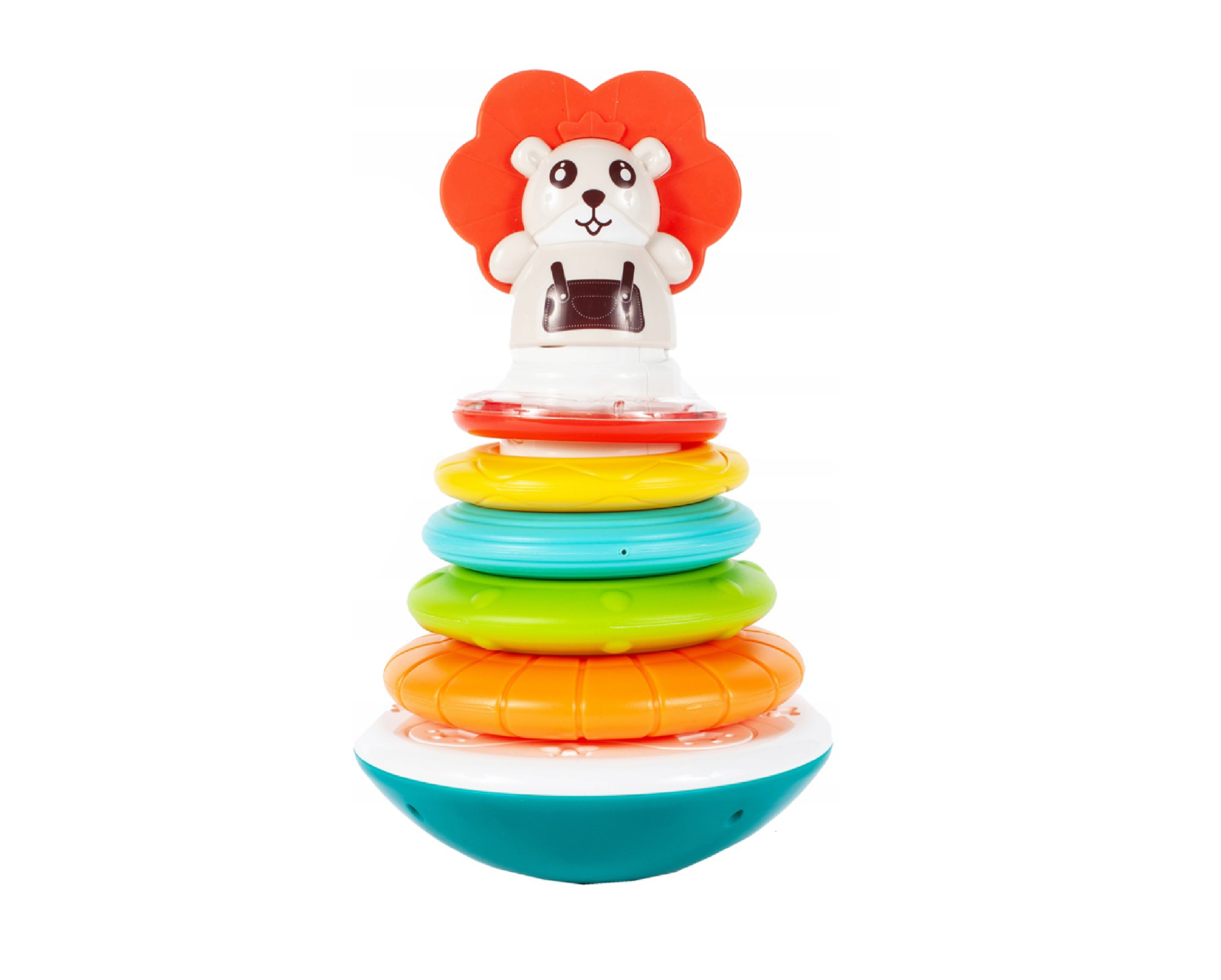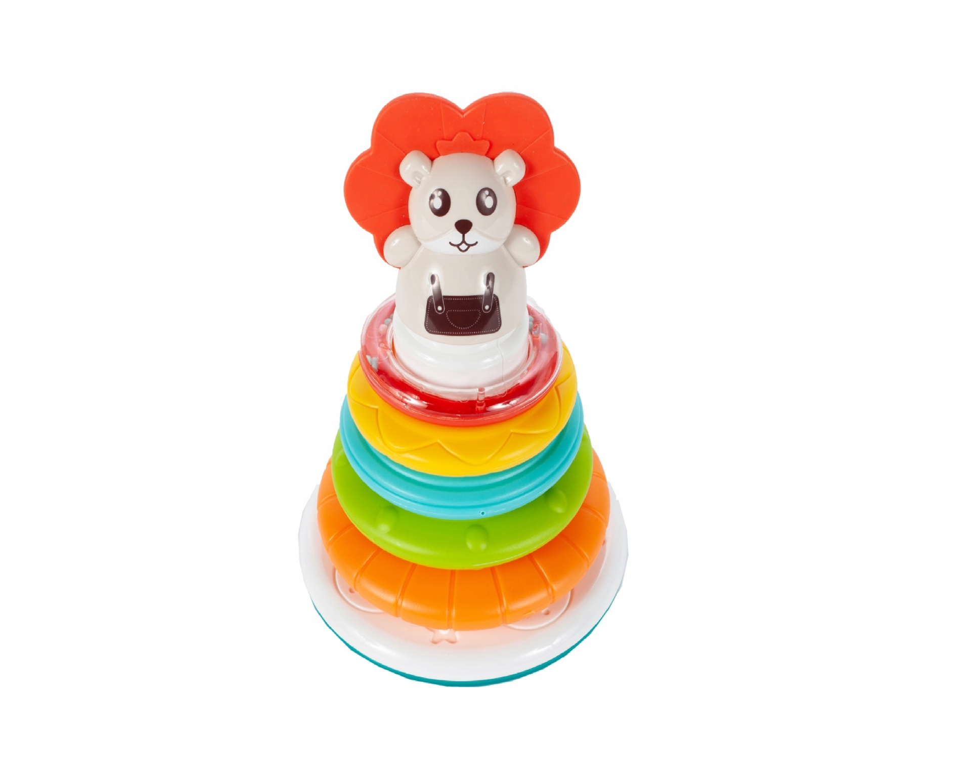 Multe culori si forme stimuleaza stimulii vizuali la copil, dezvoltand corespunzator abilitatile cognitiv-motorii. Din jucarie ies sunete diferite cand se pune cercul. La punerea cercului, din jucarie ies diverse sunete, iar dupa apasarea butonului de sub animalul de companie ies melodii scurte si sunete de animale.