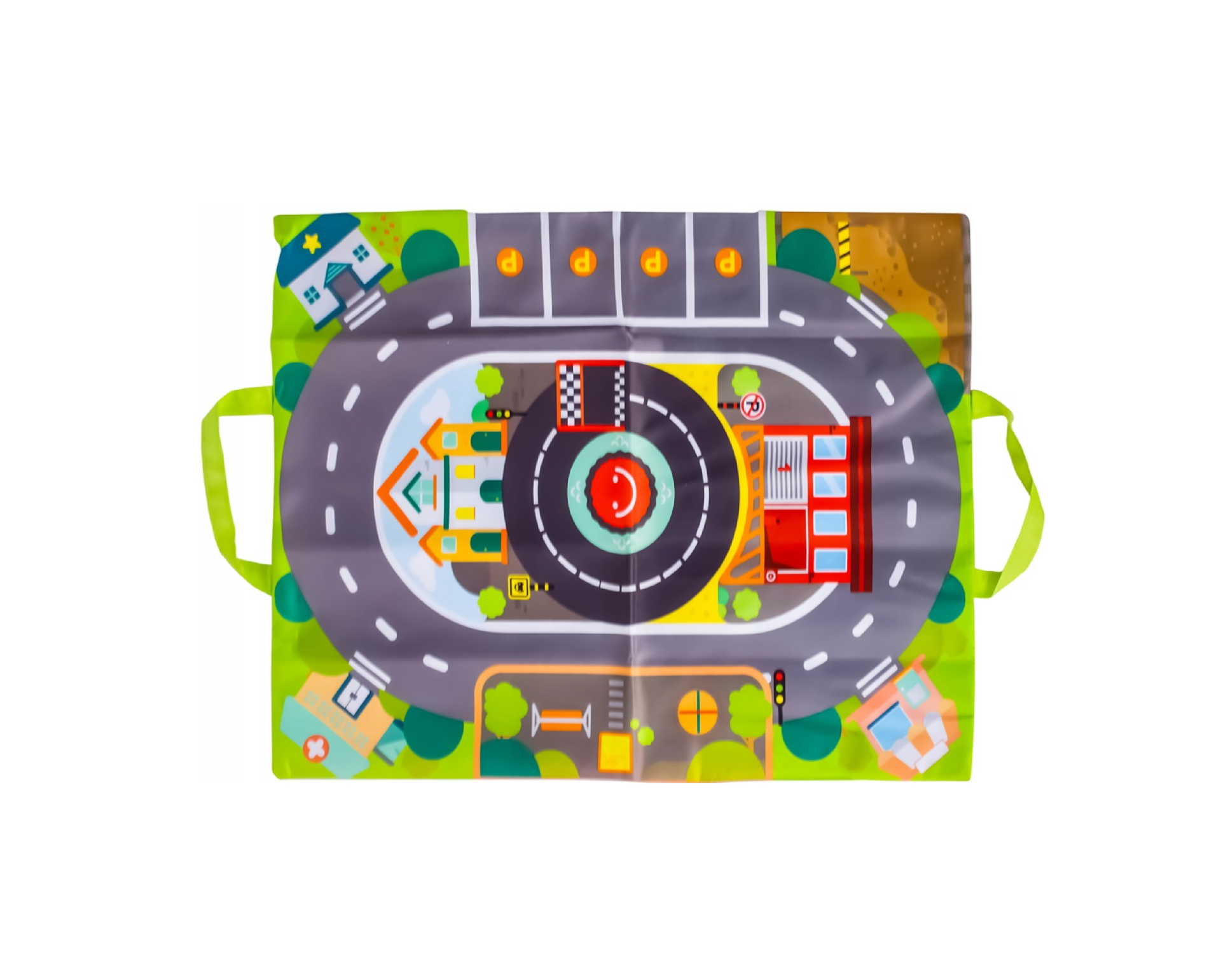 Covorasul are velcro pe cealalta parte, ceea ce ii permite sa fie pliat si folosit ca geanta. Acest lucru face mult mai usor sa depozitati masinile din set. Covorasul este extrem de colorat si moale la atingere, se poate spala la masina la temperatura scazuta (30 grade Celsius).