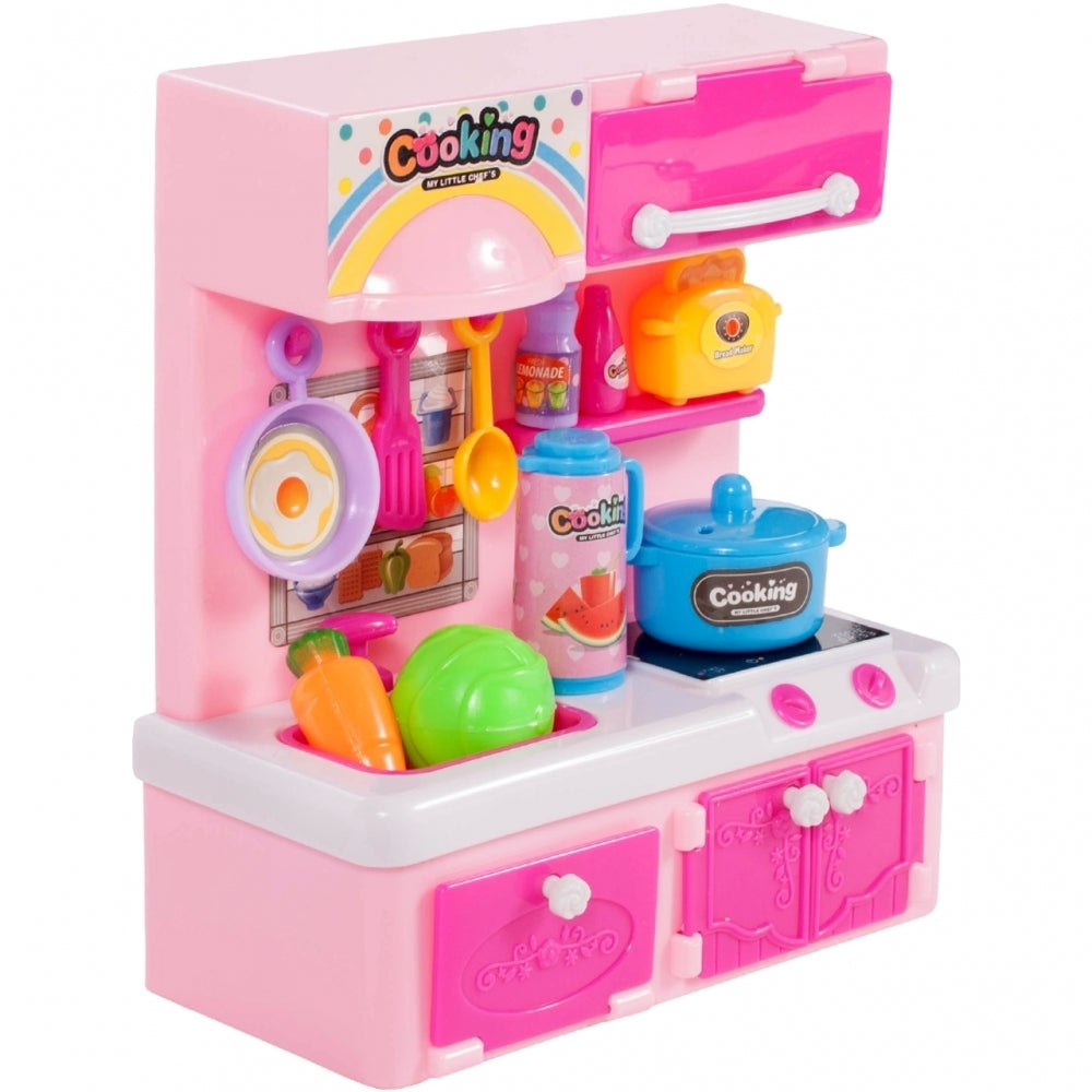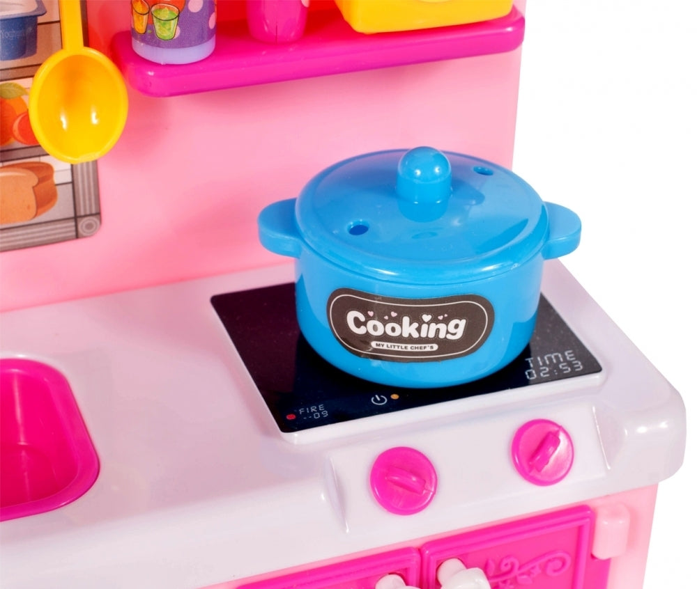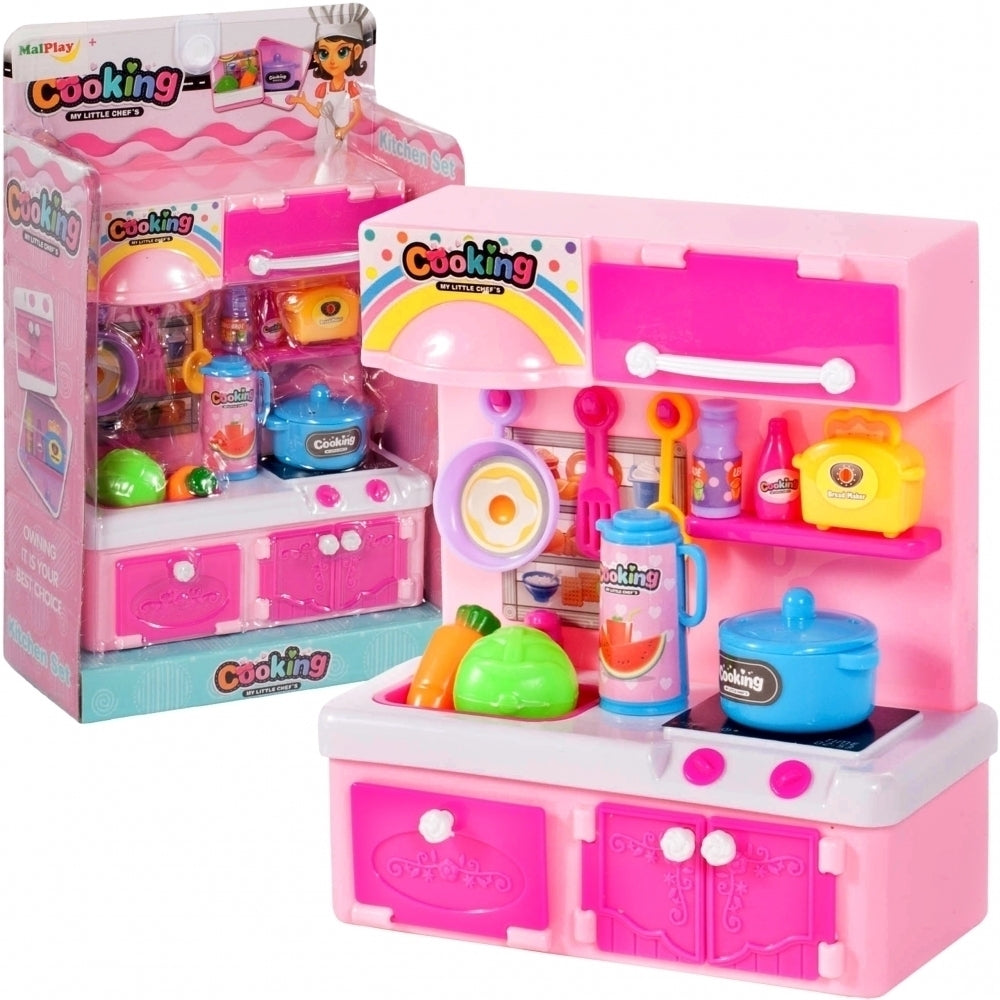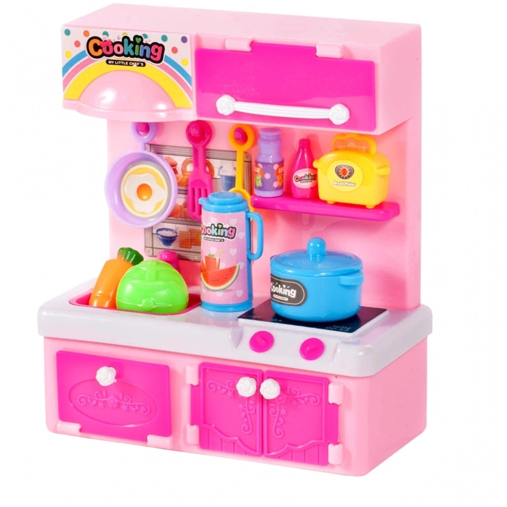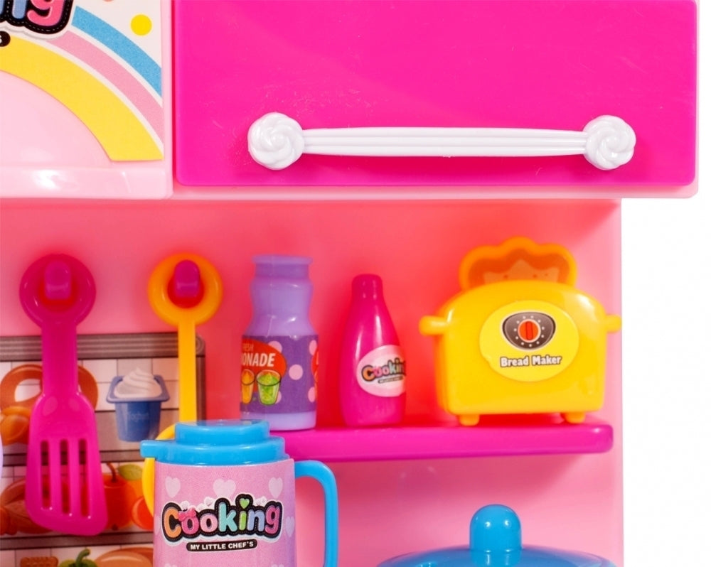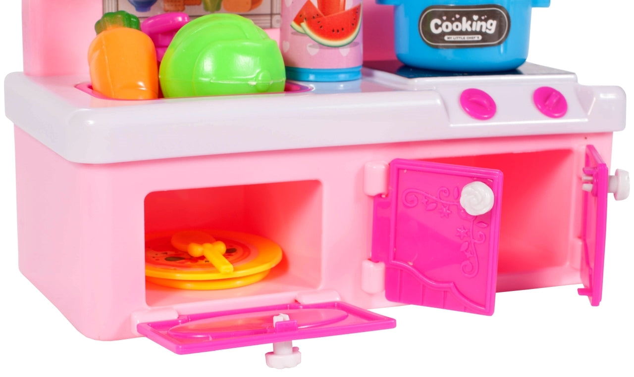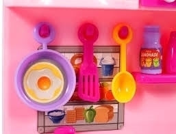 Bucataria pentru papusi este roz si contine instrumente de bucatarie.