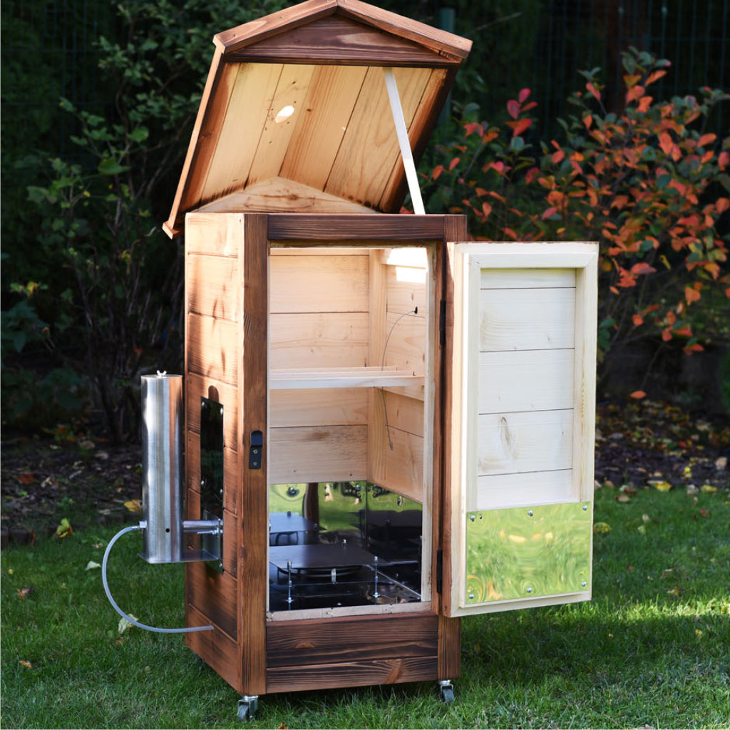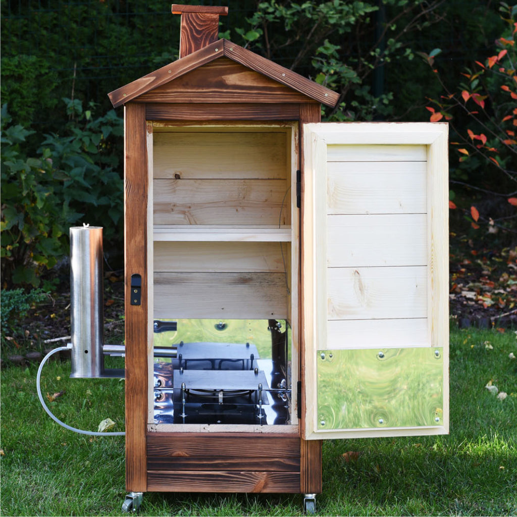 Afumatoarea este impregnata cu o impreganre de lemn pe baza de apa care nu patrunde in produsele afumate si este 100% sigura. Este bronzata suplimentar, ceea ce pune in evidenta culoarea frumoasa a impregnarii si o protejeaza suplimentar.