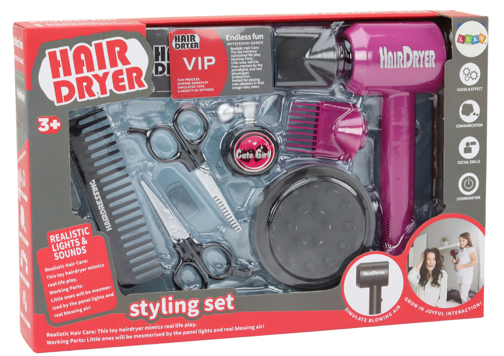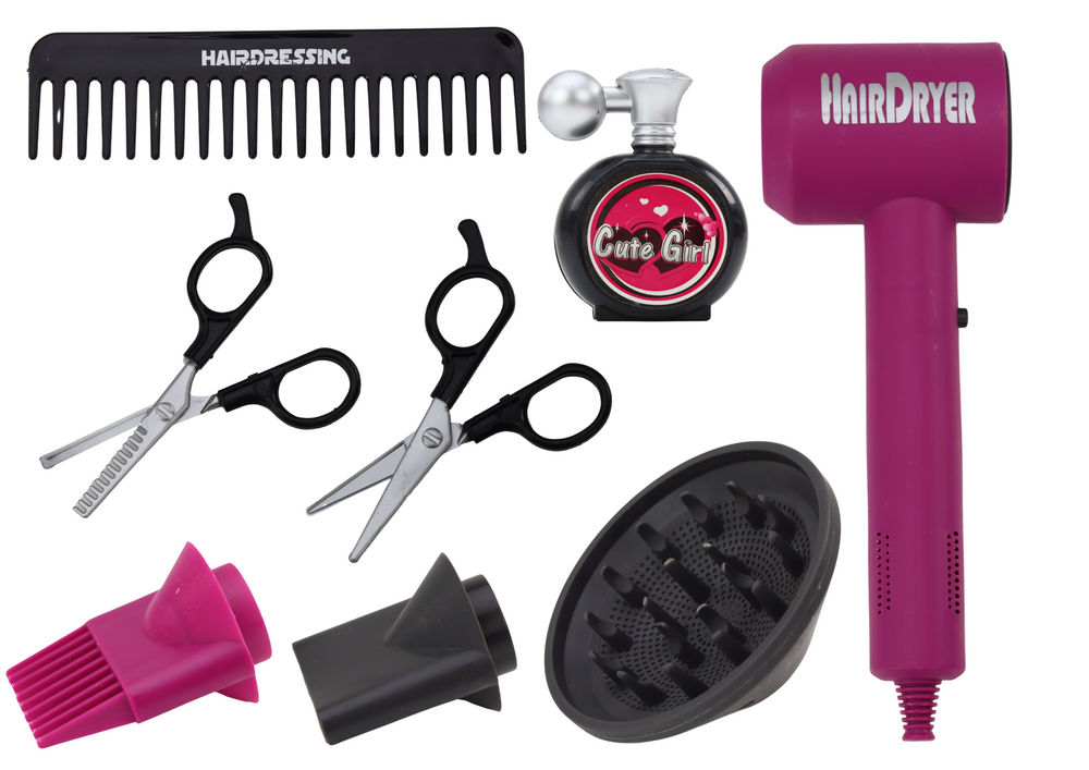 Piesa centrala a setului este un uscator de par roz, care adauga farmec si atractivitate jucariei. Uscatorul este alimentat de doua baterii, permitand o simulare realista a uscarii parului prin emiterea unei rafale de aer. In plus, uscatorul are trei accesorii diferite care permit o varietate de stiluri de uscare, adaugand un element de versatilitate si creativitate jocului.