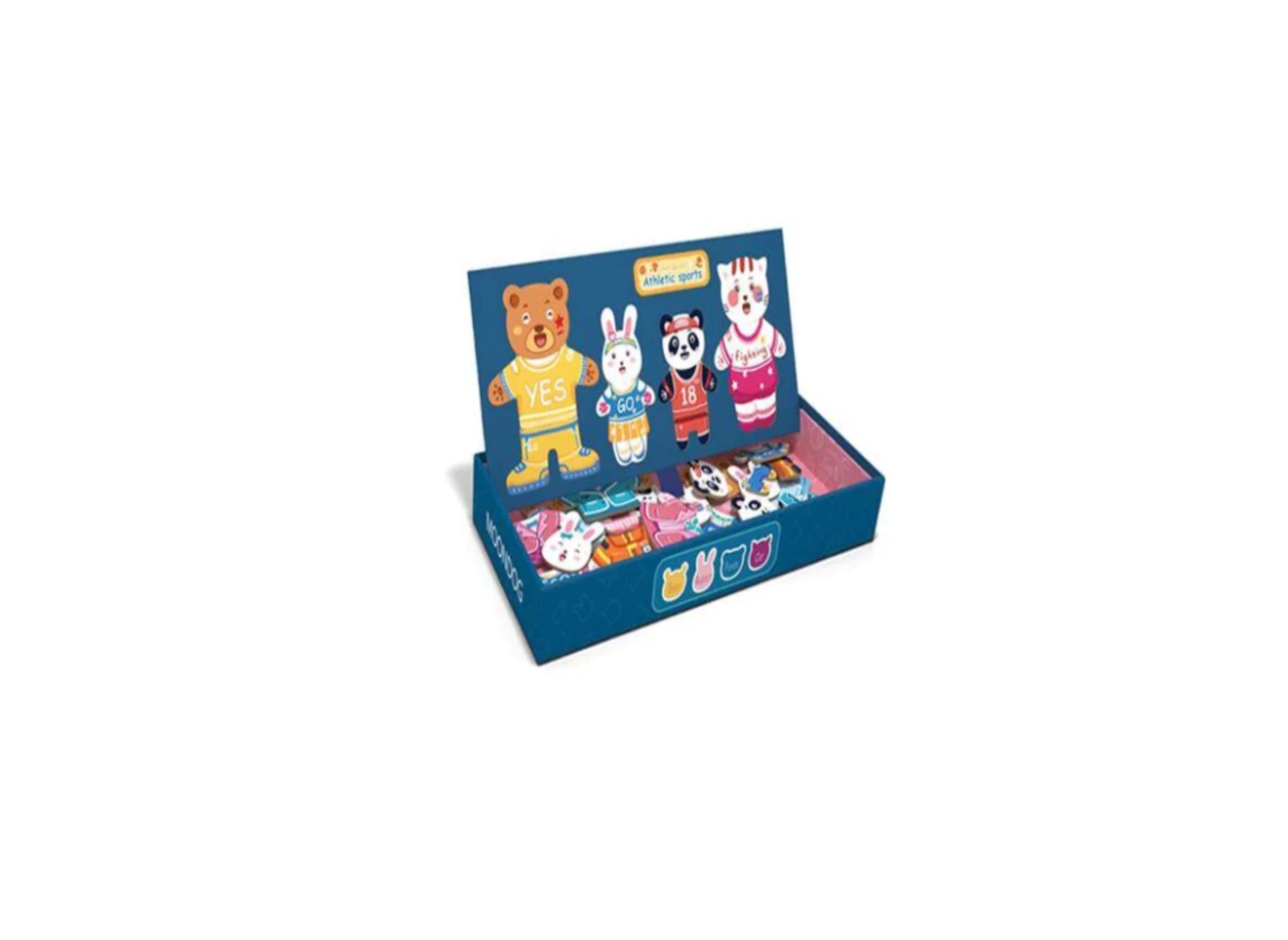 Setul este format din 65 de piese magnetice pentru haine . Datorita acestui lucru, copilul mic poate schimba liber si potriveste elementele prin schimbarea aranjamentului hainelor ursuletilor de plus. Aceasta ofera un numar infinit de combinatii. Setul include 5 costume tematice gata facute pentru toti ursuletii: