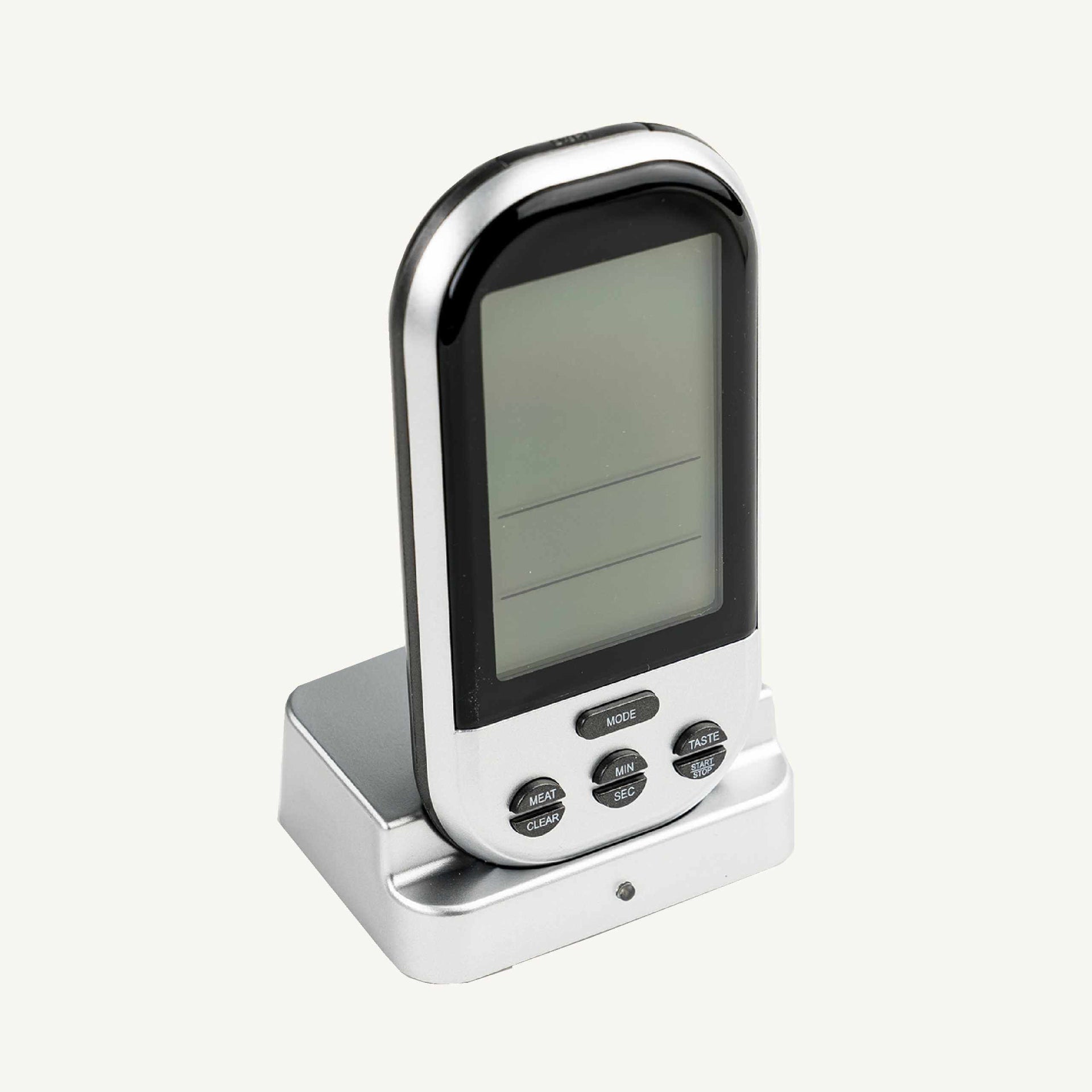 _x000D_Termometru electronic elegant de bucatarie pe un suport cu o sonda alimentara. Va facilita prepararea mancarurilor intr-un afumator si pe gratar. Va indica temperatura de la 0 la 250 ° C. Termometrul este foarte usor de utilizat. Indispensabil in prepararea carnurilor, in special a fripturii cu diferite grade de preparare. Termometrul este fabricat din materiale rezistente si este usor de curatat. Cand un anumit produs atinge temperatura indicata, termometrul da o alarma.