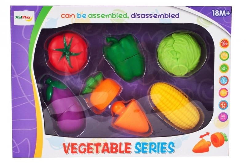 W skład zestawu wchodzi 6 sztuk warzyw: sałata, marchewka, pomidor, kukurydza, bakłażan i papryka.