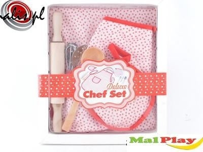 W zstawie podstawowe akcesoria kuchenne tj. wałek, trzepaczka, drewniana łycha... Fartuch wraz z rekawicą i ręczniczkiem.